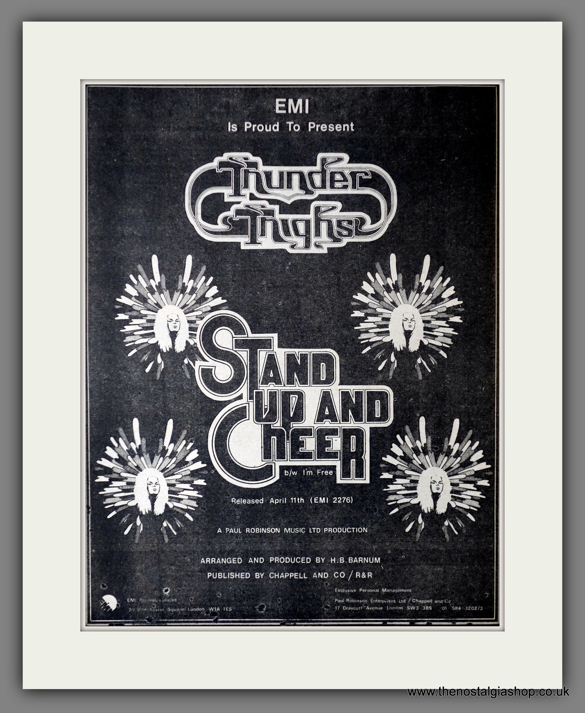 Thunder Thighs. Stand Up And Cheer. This is a large classic Original advert 1975. Presented and Supplied in a cream bevel cut mount with backing card and clear bag. Ready to fit in 20 x 16 inch frame. The mounted advert will be posted via courier and well packed - protected with a sheet of hardboard to keep it rigid. Any questions or enquiries, please get in touch, we are here to help! All our adverts, unless clearly stated are Originals from the date shown. They make excellent pieces of wall art and stunning gifts. Many are rare and hard to find and once sold, may not be replaced. Remember you are buying a piece of history. Website watermark is not on original.