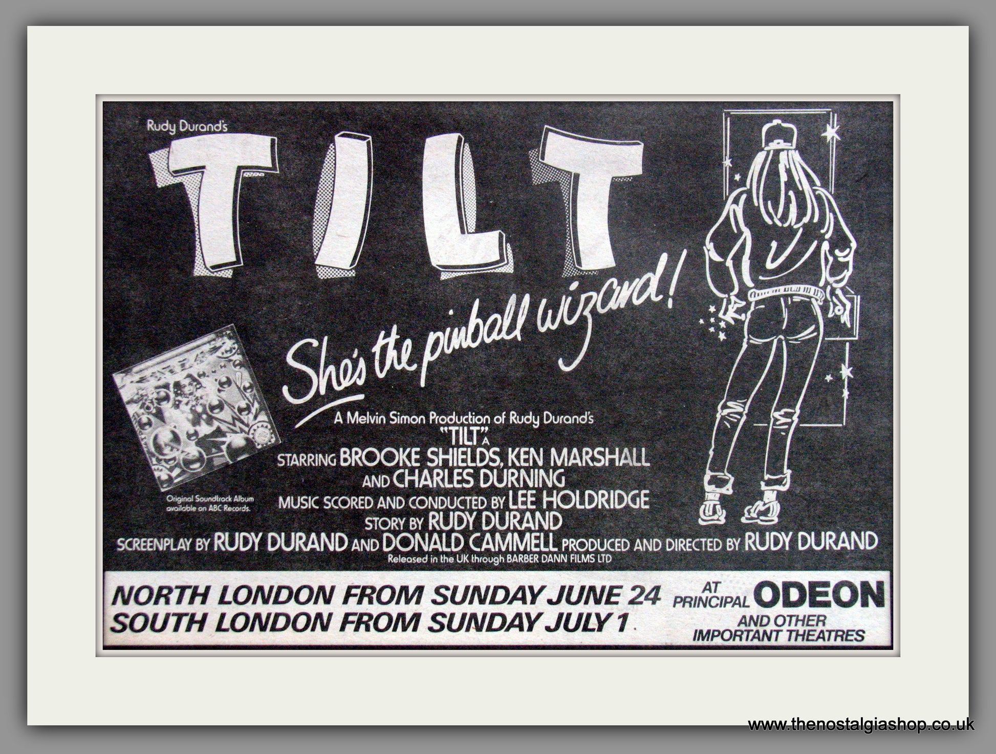 Tilt-Brooke Shields, Ken Marshall, Charles Durning. Classic original advert 1979. Presented in cream bevel cut mount with backing card and clear bag. Ready to fit in 14 x 11 inch frame. Want it framing? If so, buy this then go to Frames Available Category. Click to buy on the suitable frame and we will do the rest. All our adverts, unless clearly stated are Originals from the date shown. They make excellent pieces of wall art and stunning gifts. Many are rare and hard to find and once sold, may not be replaced. Remember you are buying a piece of history. Website watermark is not on original.