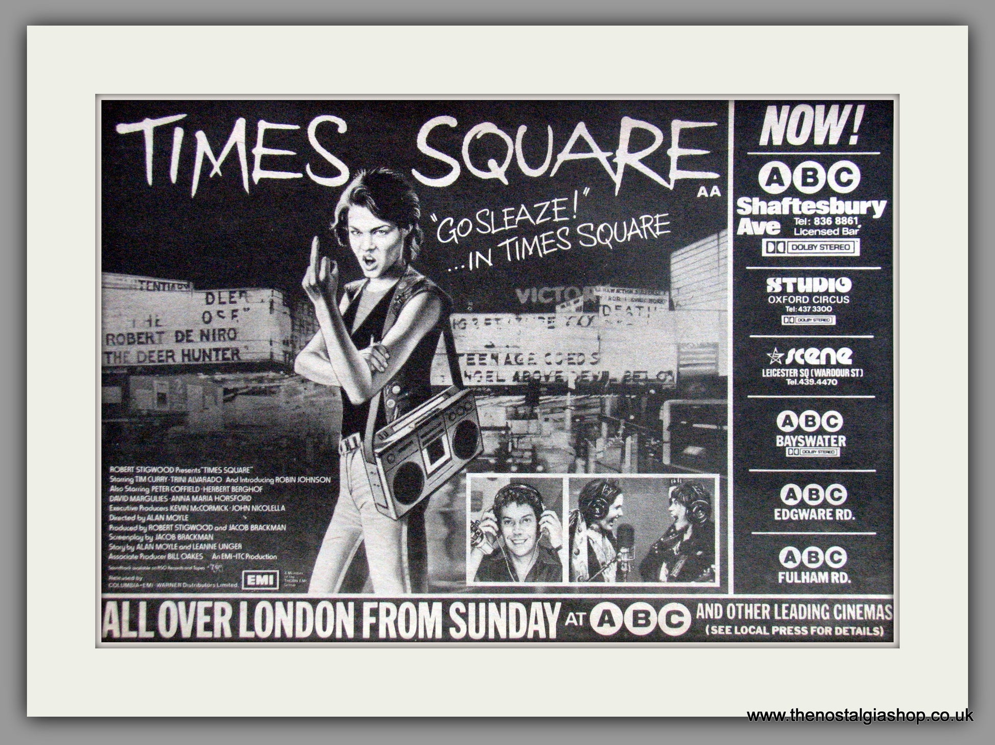 Times Square-Tim Curry, Peter Coffield. Classic original advert 1981. Presented in cream bevel cut mount with backing card and clear bag. Ready to fit in 14 x 11 inch frame. Want it framing? If so, buy this then go to Frames Available Category. Click to buy on the suitable frame and we will do the rest. All our adverts, unless clearly stated are Originals from the date shown. They make excellent pieces of wall art and stunning gifts. Many are rare and hard to find and once sold, may not be replaced. Remember you are buying a piece of history. Website watermark is not on original.