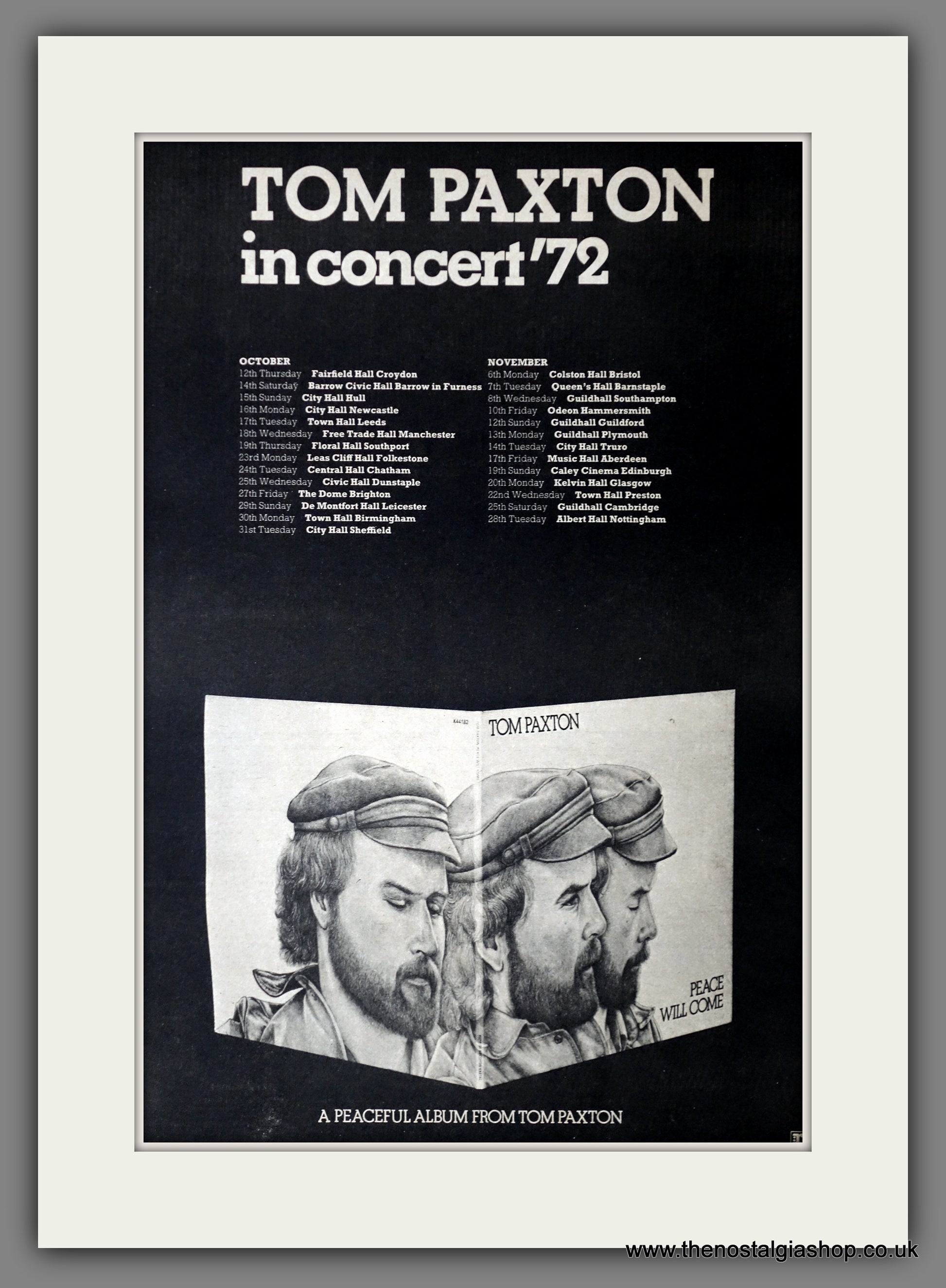 Tom Paxton In Concert. Vintage Advert. This is a large classic Original advert 1972. Presented in cream bevel cut mount with backing card and clear bag. Ready to fit in 20 x 16 inch frame. The mounted advert will be posted via courier and well packed - protected with a sheet of hardboard to keep it rigid. Any questions or inquiries, please get in touch, we are here to help! All our adverts, unless clearly stated are Originals from the date shown. They make excellent pieces of wall art and stunning gifts. Many are rare and hard to find and once sold, may not be replaced. Remember you are buying a piece of history. Website watermark is not on original.
