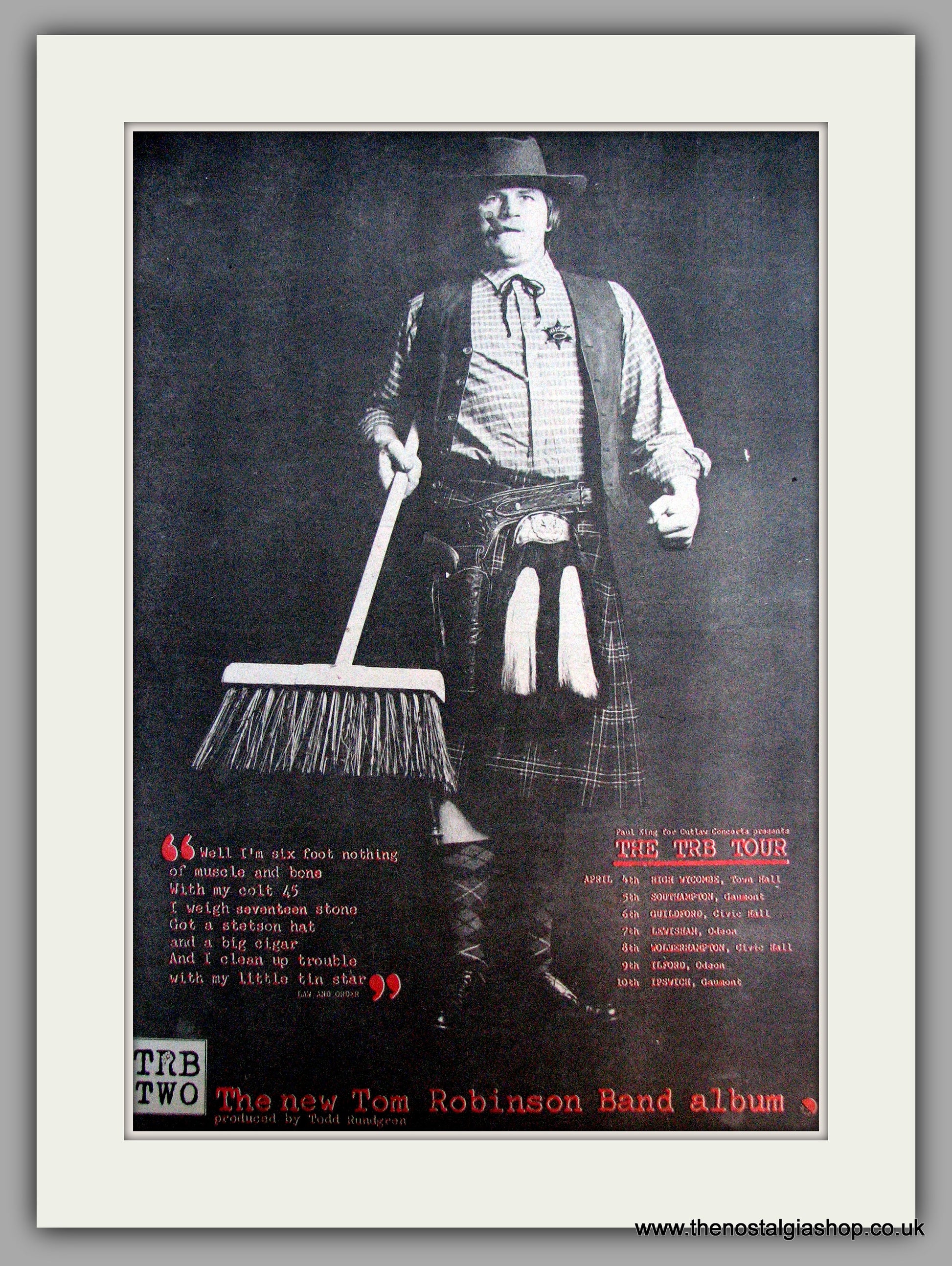 Tom Robinson Band. TRB Two. Tour Dates. Vintage Advert 1979 (ref AD9886). Presented and supplied in a cream bevel cut mount with backing card and clear bag. Ready to fit in a 20x16 inch frame. The mounted advert will be posted via courier and well packed - protected with a sheet of hardboard to keep it rigid. Any questions or enquiries, please get in touch, we are here to help! All our adverts, unless clearly stated are originals from the date shown. They make excellent pieces of wall art and stunning gifts. Many are rare and hard to find and once sold, may not be replaced. Remember you are buying a piece of history. Website watermark is not on original.