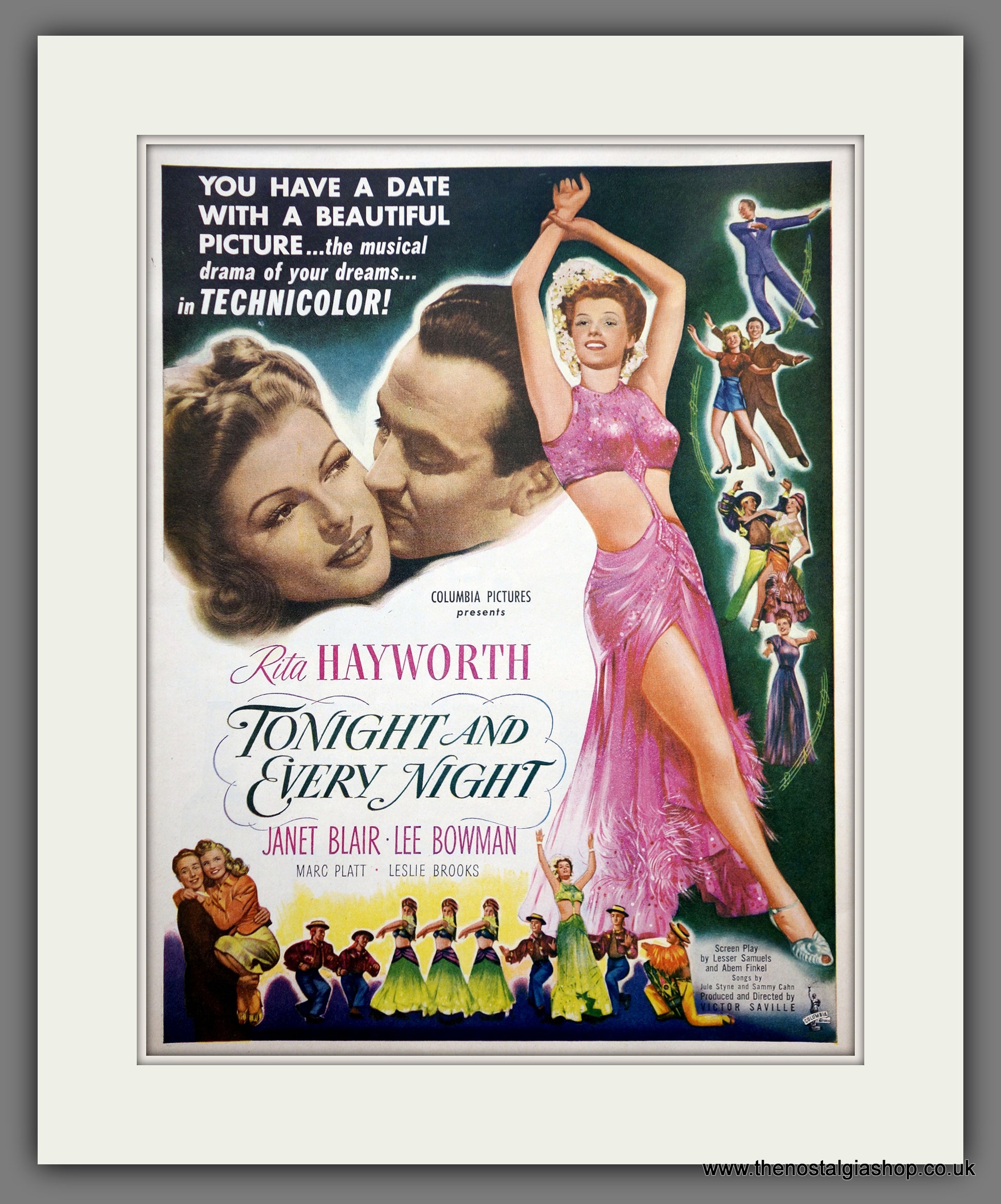 Tonight And Every Night. Rita Hayworth, Janet Blair. Classic Original Advert 1945. Presented in cream bevel cut mount with backing card. Ready to fit in 18 x 14 inch frame. All our adverts, unless clearly stated are Originals from the date shown They make excellent pieces of wall art and stunning gifts. Many are rare and hard to find and once sold, may not be replaced. Remember you are buying a piece of history. Website watermark is not on original.