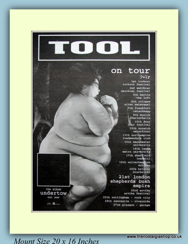 Tool On Tour July Original Advert 1994 (ref AD9156). Presented and supplied in a cream bevel cut mount with backing card and clear bag. Ready to fit in a 20x16 inch frame. The mounted advert will be posted via courier and well packed - protected with a sheet of hardboard to keep it rigid. Any questions or enquiries, please get in touch, we are here to help! All our adverts, unless clearly stated are originals from the date shown. They make excellent pieces of wall art and stunning gifts. Many are rare and hard to find and once sold, may not be replaced. Remember you are buying a piece of history. Website watermark is not on original.