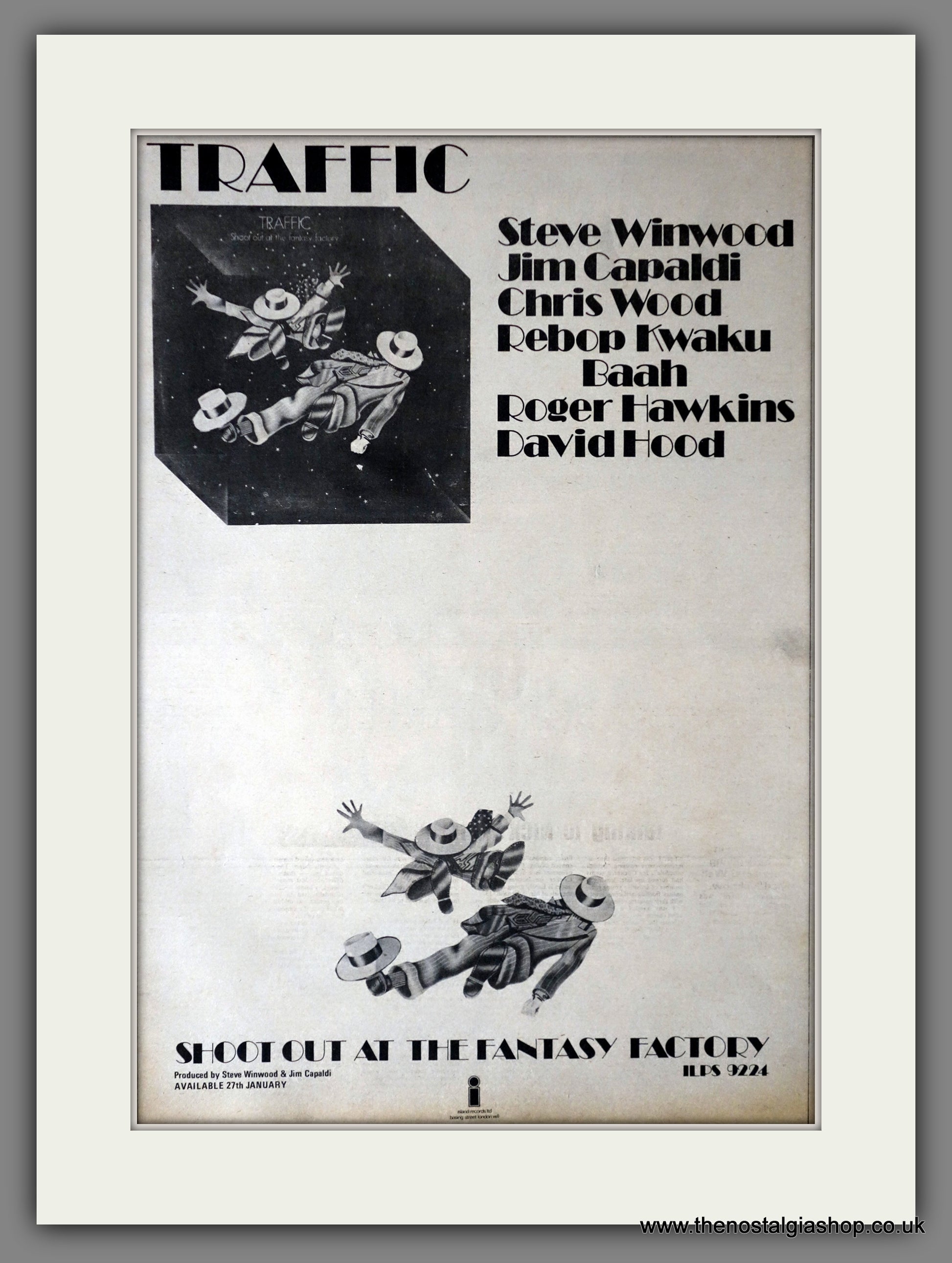 Traffic. Shoot Out At The Fantasy Factory. Vintage Advert. This is a large classic Original advert 1973. Presented in cream bevel cut mount with backing card and clear bag. Ready to fit in 20 x 16 inch frame. The mounted advert will be posted via courier and well packed - protected with a sheet of hardboard to keep it rigid. Any questions or inquiries, please get in touch, we are here to help! All our adverts, unless clearly stated are Originals from the date shown. They make excellent pieces of wall art and stunning gifts. Many are rare and hard to find and once sold, may not be replaced. Remember you are buying a piece of history. Website watermark is not on original.