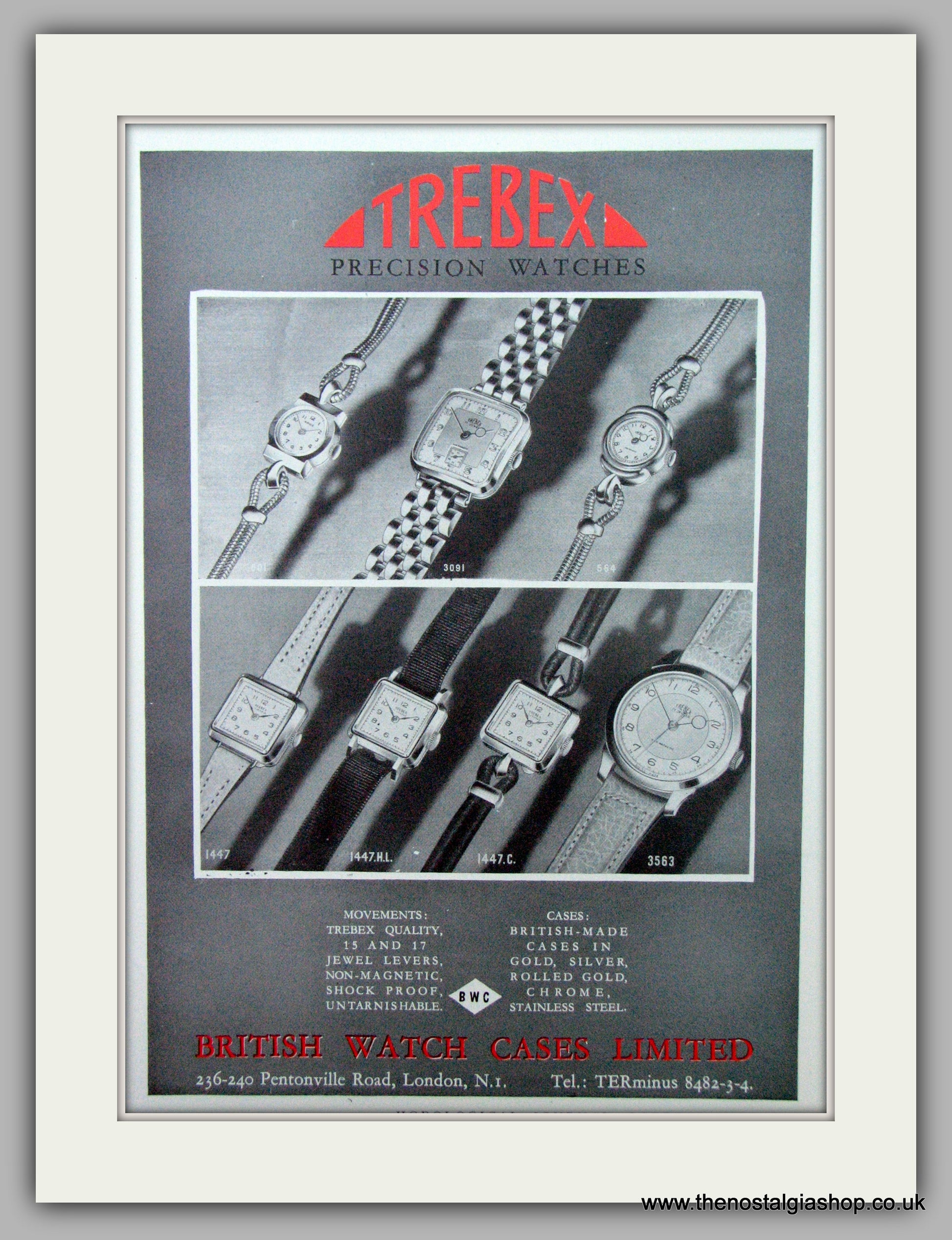 Trebex Watches. Watch cases. Vintage Advert. Original Advert 1951. Presented in cream bevel cut mount with backing card and clear bag. Ready to fit in 14 x 11 inch frame. Want it framing? If so, buy this then go to Frames Available Category. Click to buy on the suitable frame(s) and we will do the rest. All our adverts, unless clearly stated are Originals from the date shown. They make excellent pieces of wall art and stunning gifts. Many are rare and hard to find and once sold, may not be replaced. Remember you are buying a piece of history. Website watermark is not on original.