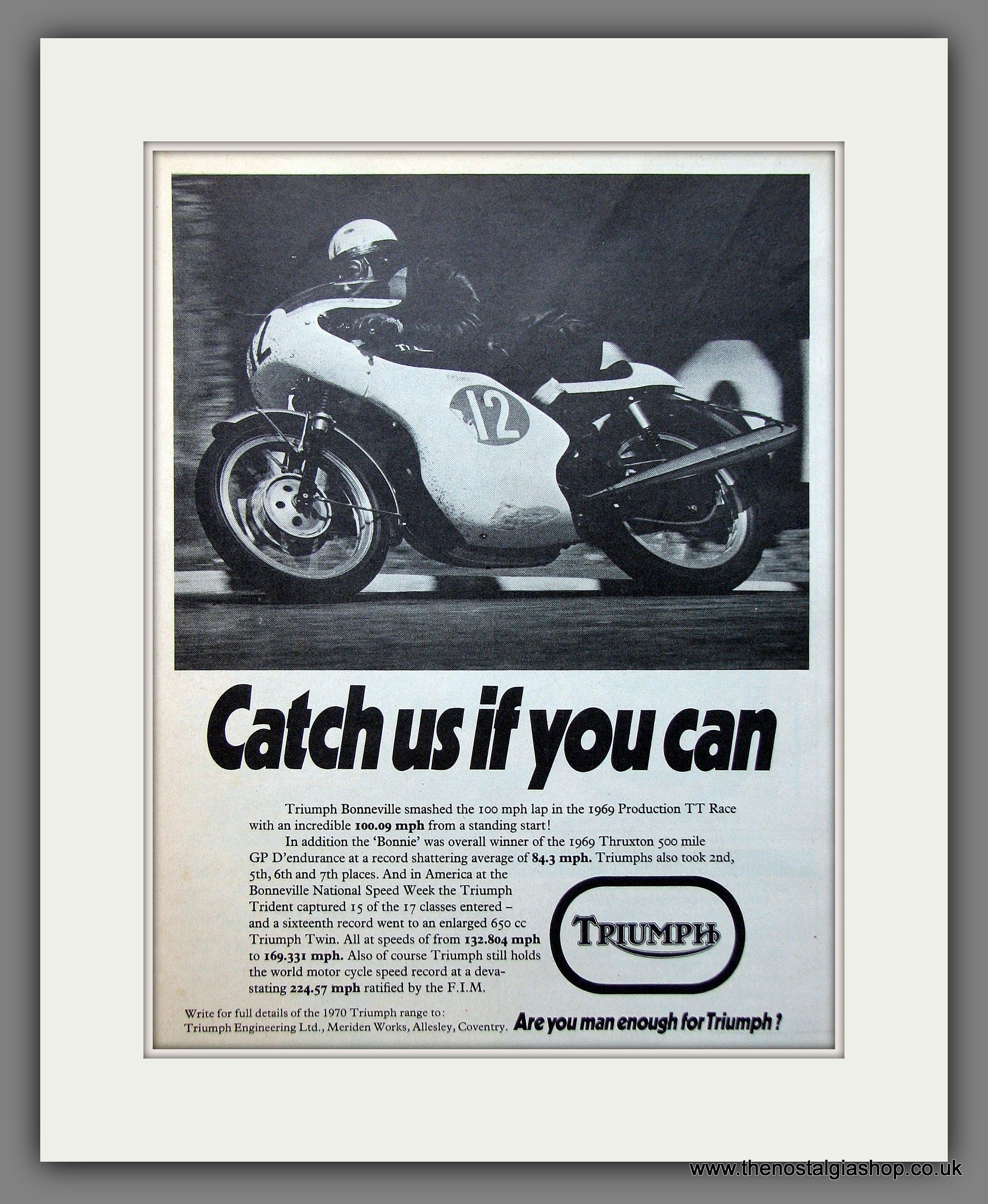 Triumph Bonneville 100mph Lap at the T.T. Classic Original Advert 1970. Presented and Supplied in a 14 x 11 Inch, cream bevel cut mount with backing card and Clear Bag. Ready to frame. All our adverts, unless clearly stated are Originals from the date shown They make excellent pieces of wall art and stunning gifts. Many are rare and hard to find and once sold, may not be replaced. Remember you are buying a piece of history. Website watermark is not on original. Triumph Motorcycles, Vintage Triumph Motorbikes, Triumph Engineering Co.