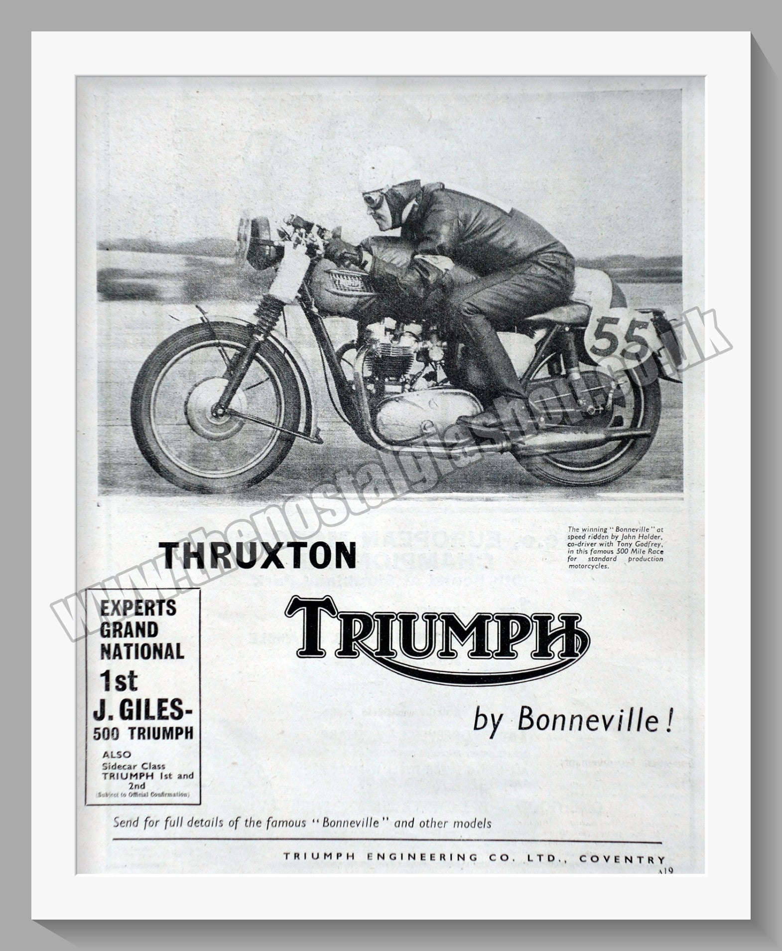 Triumph Bonneville, Experts Grand National. Classic Original Advert 1961. Presented and Supplied in a 14 x 11 Inch, cream bevel cut mount with backing card and Clear Bag. Ready to frame. All our adverts, unless clearly stated are Originals from the date shown They make excellent pieces of wall art and stunning gifts. Many are rare and hard to find and once sold, may not be replaced. Remember you are buying a piece of history. Website watermark is not on original. Triumph Motorcycles, Vintage Triumph Motorbikes, Triumph Engineering Co.