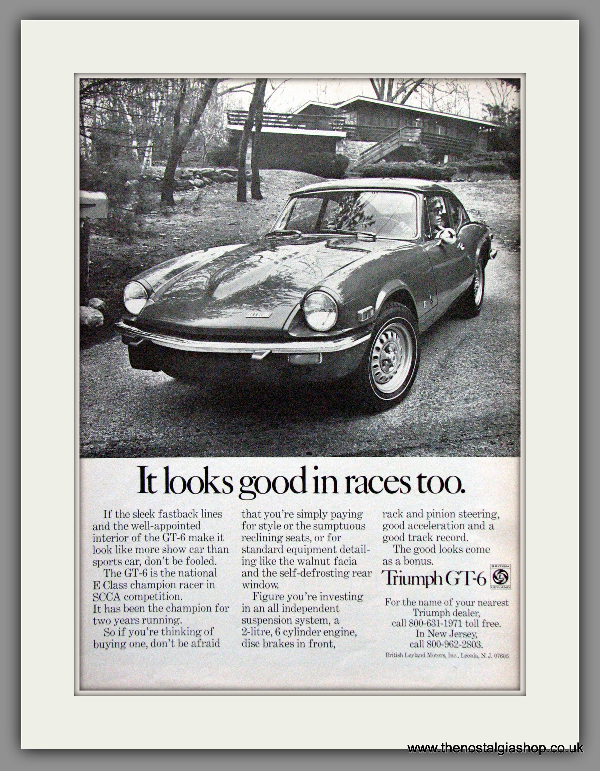 Triumph GT6. Vintage Advert. Classic Original American advert 1971. Presented and Supplied in cream bevel cut mount, Size 14 x 11 inches with backing card and clear bag. Ready to frame. Want it framing? If so, buy this then go to Frames Available Category. Click to buy on the suitable frame and we will do the rest. All our adverts, unless clearly stated are Originals from the date shown They make excellent pieces of wall art and stunning gifts. Many are rare and hard to find and once sold, may not be replaced. Remember you are buying a piece of history. Website watermark is not on original.