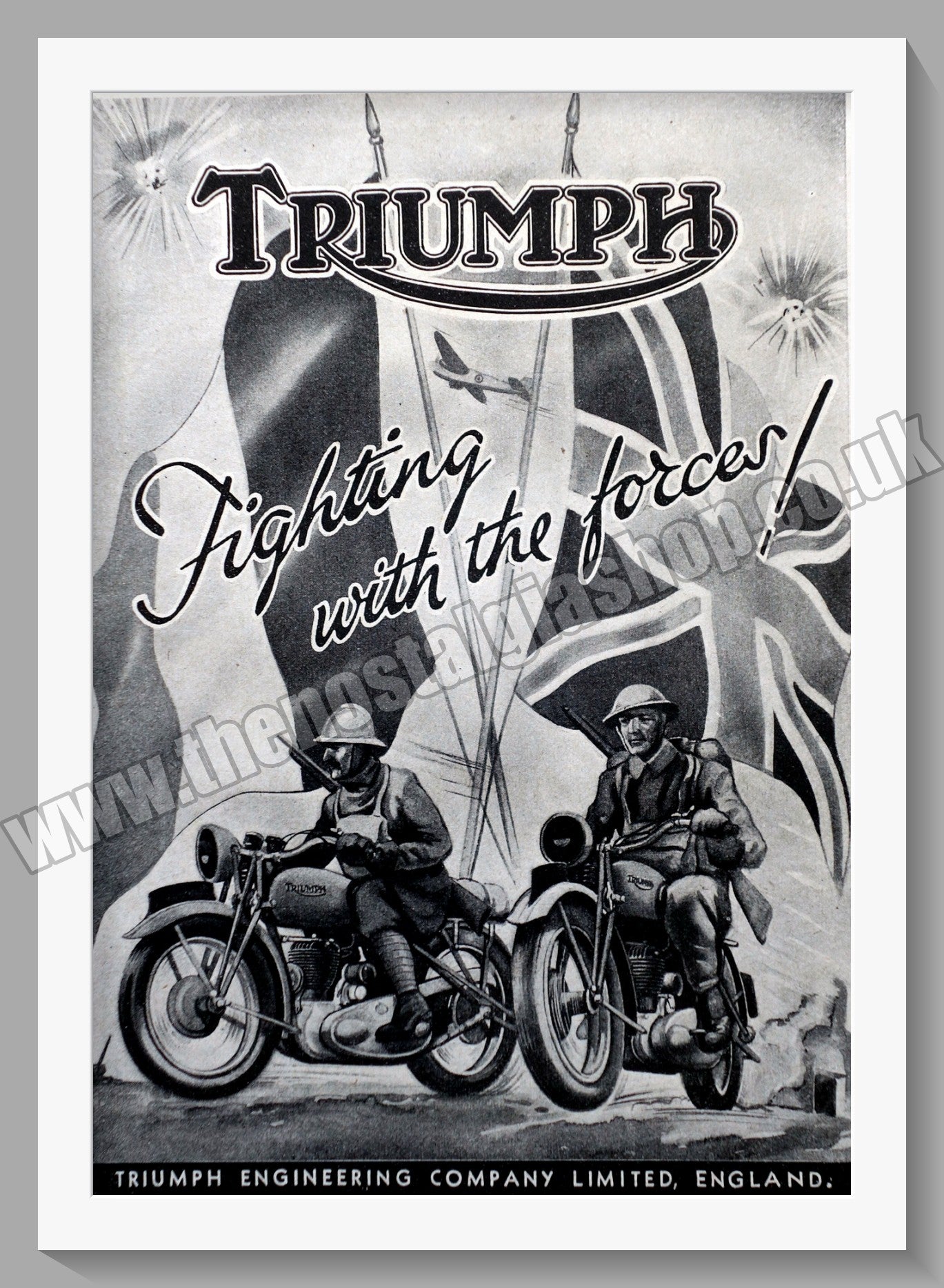 Triumph Motorcycles. Classic Original Advert 1940. Presented and Supplied in a 14 x 11 Inch, cream bevel cut mount with backing card and Clear Bag. Ready to frame. All our adverts, unless clearly stated are Originals from the date shown They make excellent pieces of wall art and stunning gifts. Many are rare and hard to find and once sold, may not be replaced. Remember you are buying a piece of history. Website watermark is not on original. Triumph Motorcycles, Vintage Triumph Motorbikes, Triumph Engineering Co.
