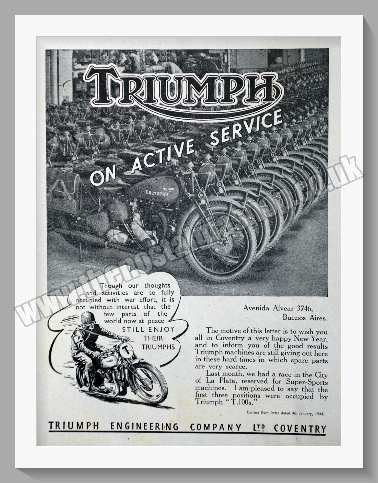Triumph Motorcycles. On Active Service. Classic Original Advert 1944. Presented and Supplied in a 14 x 11 Inch, cream bevel cut mount with backing card and Clear Bag. Ready to frame. All our adverts, unless clearly stated are Originals from the date shown They make excellent pieces of wall art and stunning gifts. Many are rare and hard to find and once sold, may not be replaced. Remember you are buying a piece of history. Website watermark is not on original. Triumph Motorcycles, Vintage Triumph Motorbikes, Triumph Engineering Co.