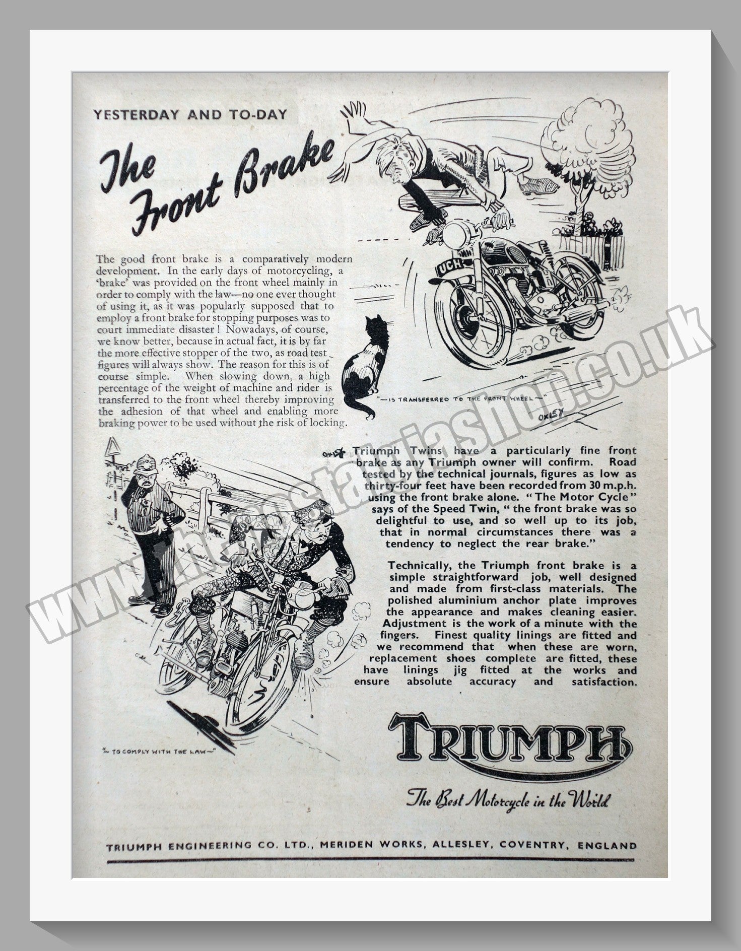 Triumph Motorcycles. Classic Original Advert 1949. Presented and Supplied in a 14 x 11 Inch, cream bevel cut mount with backing card and Clear Bag. Ready to frame. All our adverts, unless clearly stated are Originals from the date shown They make excellent pieces of wall art and stunning gifts. Many are rare and hard to find and once sold, may not be replaced. Remember you are buying a piece of history. Website watermark is not on original. Triumph Motorcycles, Vintage Triumph Motorbikes, Triumph Engineering Co.