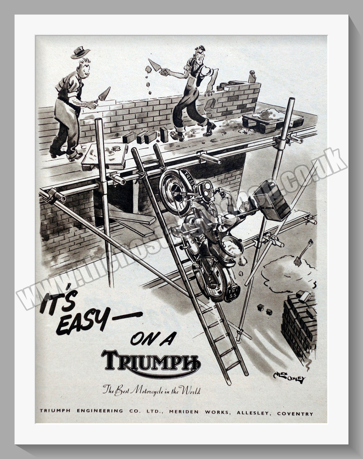 Triumph Motorcycles. Classic Original Advert 1955. Presented and Supplied in a 14 x 11 Inch, cream bevel cut mount with backing card and Clear Bag. Ready to frame. All our adverts, unless clearly stated are Originals from the date shown They make excellent pieces of wall art and stunning gifts. Many are rare and hard to find and once sold, may not be replaced. Remember you are buying a piece of history. Website watermark is not on original. Triumph Motorcycles, Vintage Triumph Motorbikes, Triumph Engineering Co.