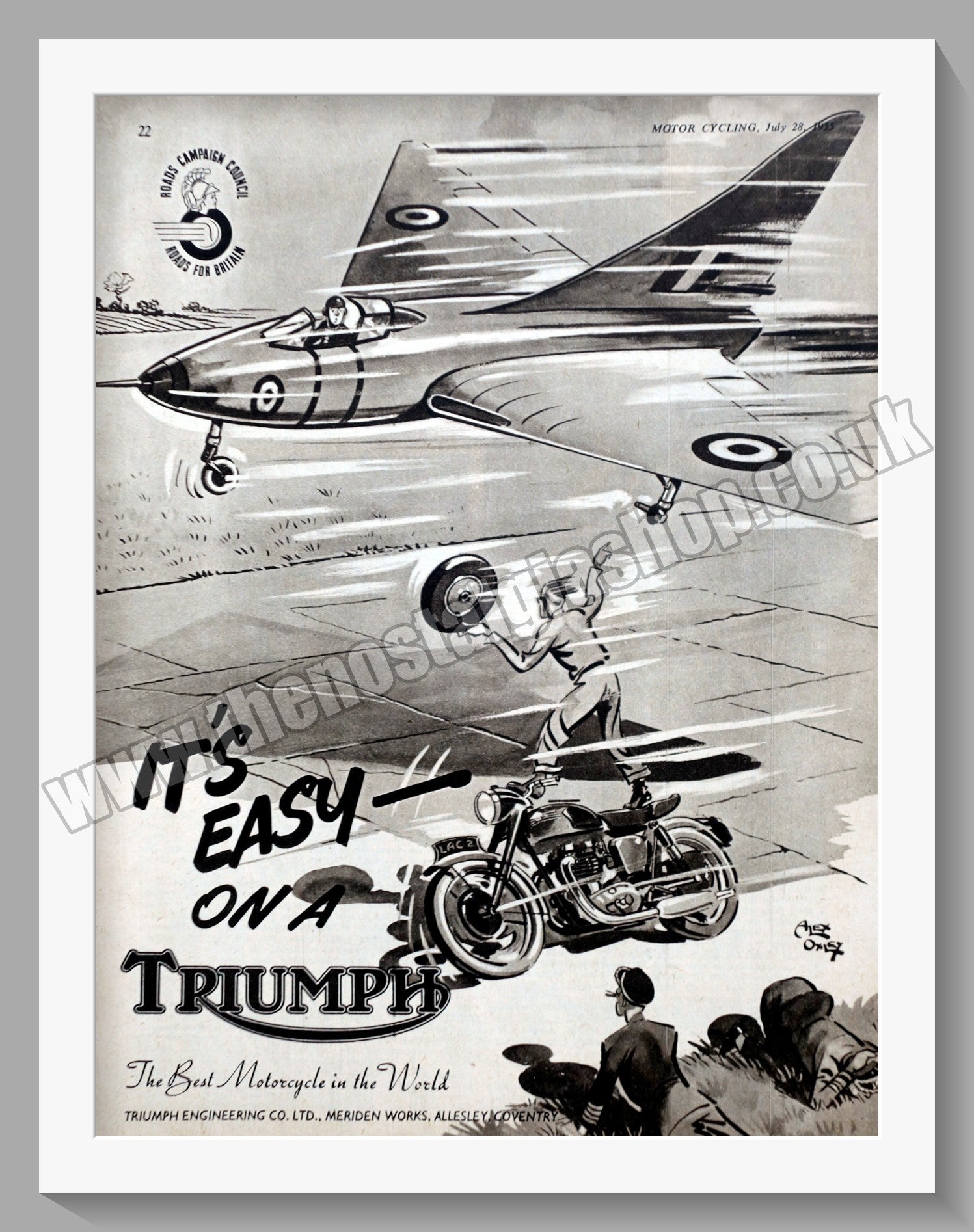 Triumph Motorcycles. Classic Original Advert 1955. Presented and Supplied in a 14 x 11 Inch, cream bevel cut mount with backing card and Clear Bag. Ready to frame. All our adverts, unless clearly stated are Originals from the date shown They make excellent pieces of wall art and stunning gifts. Many are rare and hard to find and once sold, may not be replaced. Remember you are buying a piece of history. Website watermark is not on original. Triumph Motorcycles, Vintage Triumph Motorbikes, Triumph Engineering Co.