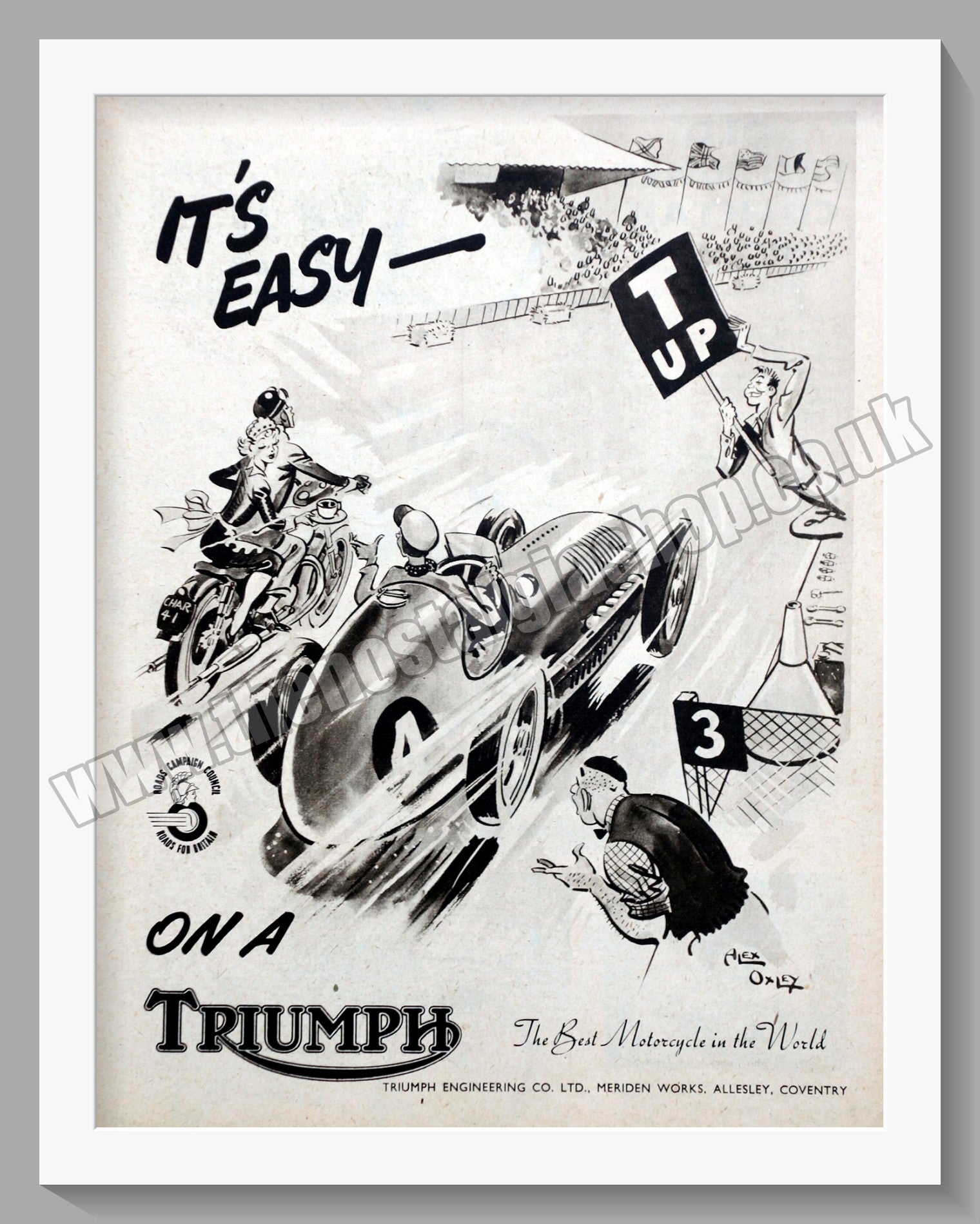 Triumph Motorcycles. Classic Original Advert 1955. Presented and Supplied in a 14 x 11 Inch, cream bevel cut mount with backing card and Clear Bag. Ready to frame. All our adverts, unless clearly stated are Originals from the date shown They make excellent pieces of wall art and stunning gifts. Many are rare and hard to find and once sold, may not be replaced. Remember you are buying a piece of history. Website watermark is not on original. Triumph Motorcycles, Vintage Triumph Motorbikes, Triumph Engineering Co.