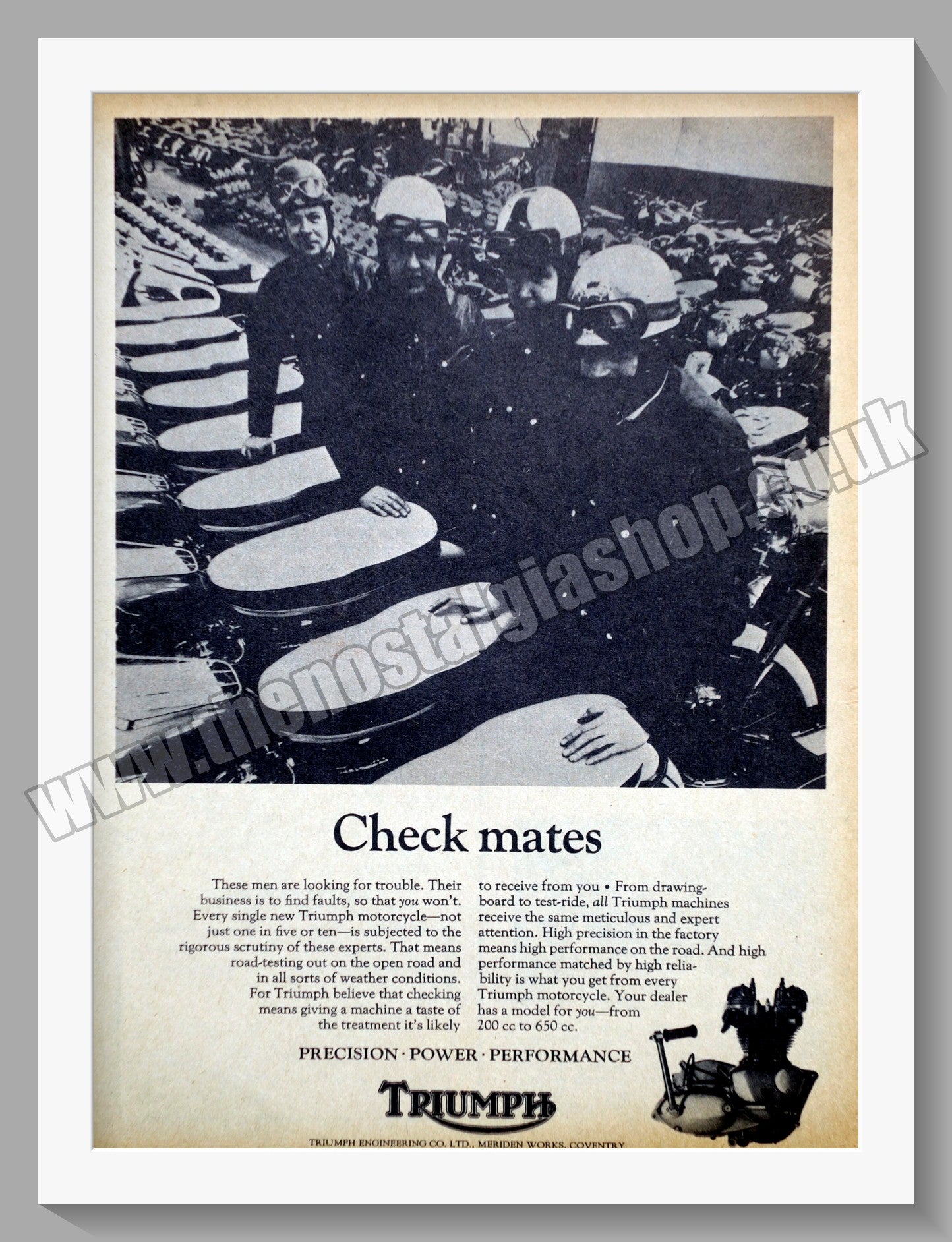 Triumph Motorcycles. Classic Original Advert 1966. Presented and Supplied in a 14 x 11 Inch, cream bevel cut mount with backing card and Clear Bag. Ready to frame. All our adverts, unless clearly stated are Originals from the date shown They make excellent pieces of wall art and stunning gifts. Many are rare and hard to find and once sold, may not be replaced. Remember you are buying a piece of history. Website watermark is not on original. Triumph Motorcycles, Vintage Triumph Motorbikes, Triumph Engineering Co.