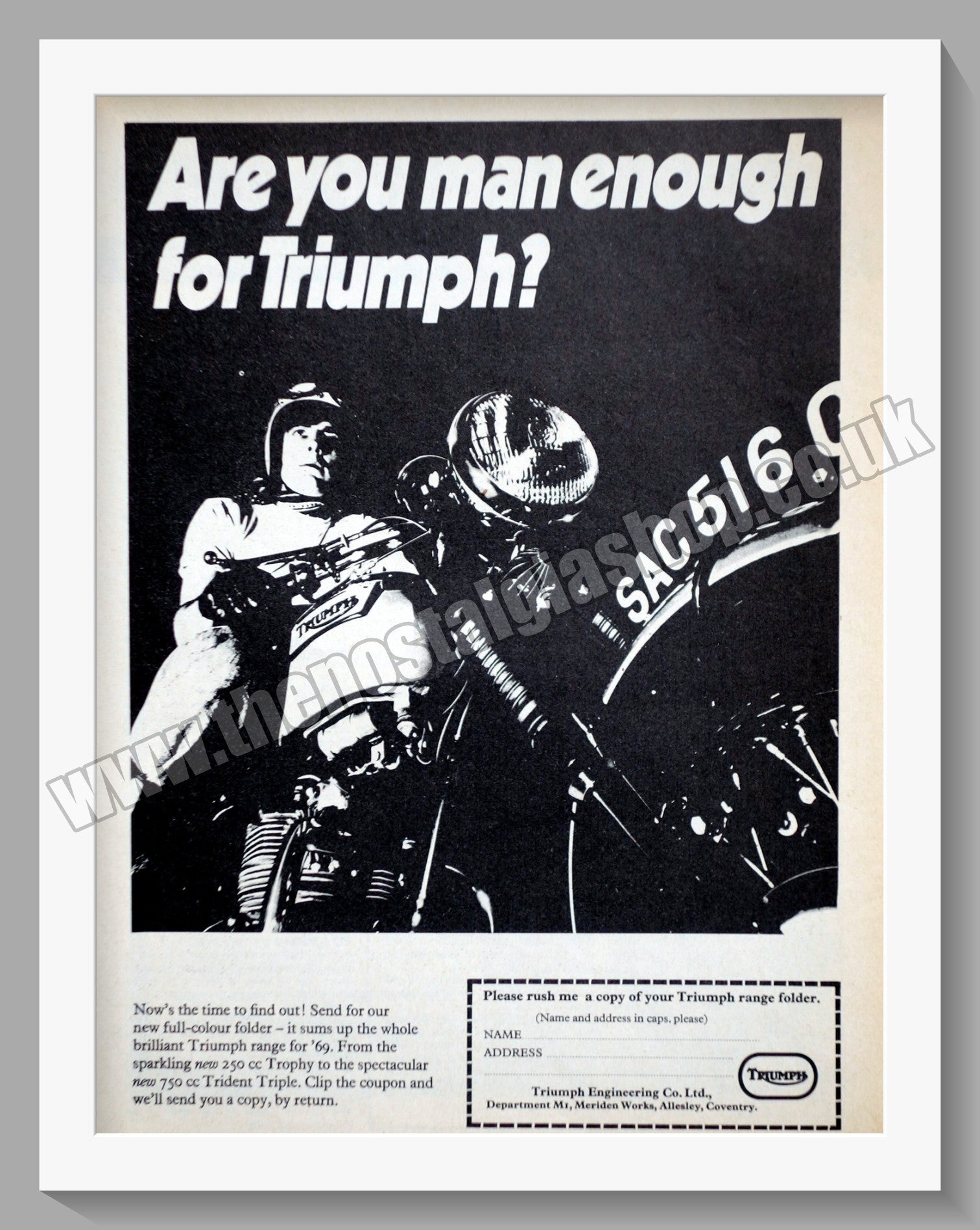 Triumph Motorcycles. Classic Original Advert 1969. Presented and Supplied in a 14 x 11 Inch, cream bevel cut mount with backing card and Clear Bag. Ready to frame. All our adverts, unless clearly stated are Originals from the date shown They make excellent pieces of wall art and stunning gifts. Many are rare and hard to find and once sold, may not be replaced. Remember you are buying a piece of history. Website watermark is not on original. Triumph Motorcycles, Vintage Triumph Motorbikes, Triumph Engineering Co.
