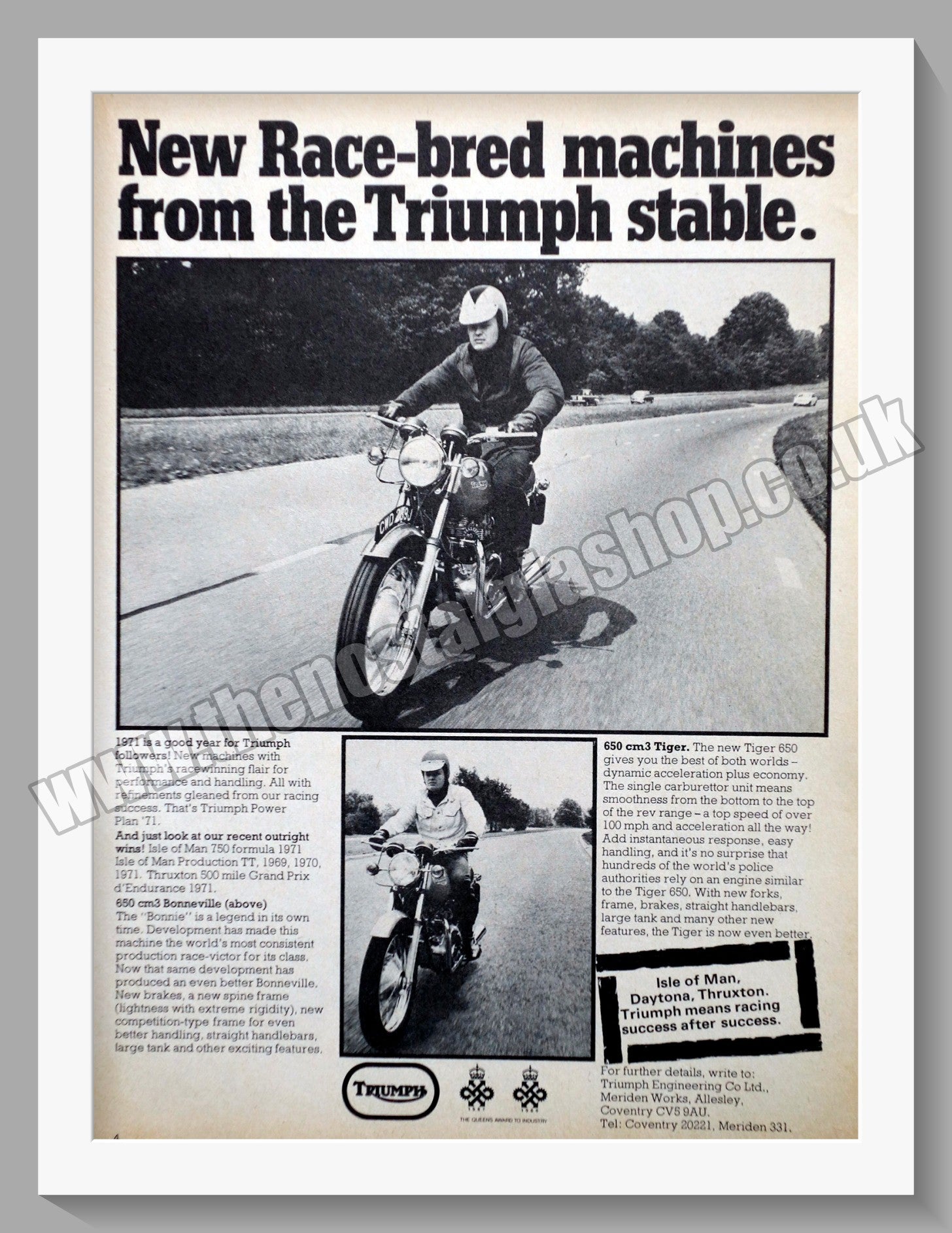 Triumph Motorcycles Race-Bred. Original advert 1971 (ref AD57943)