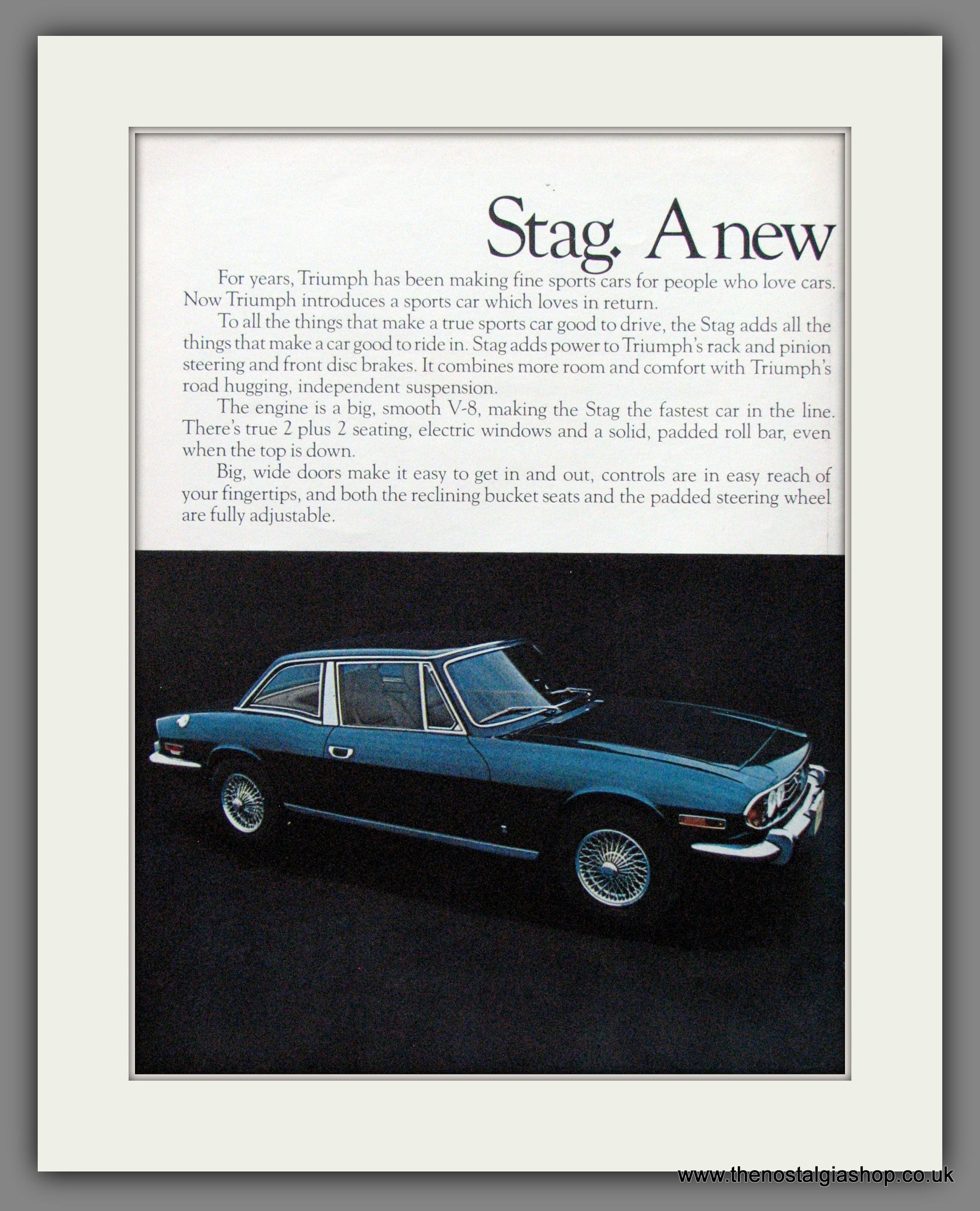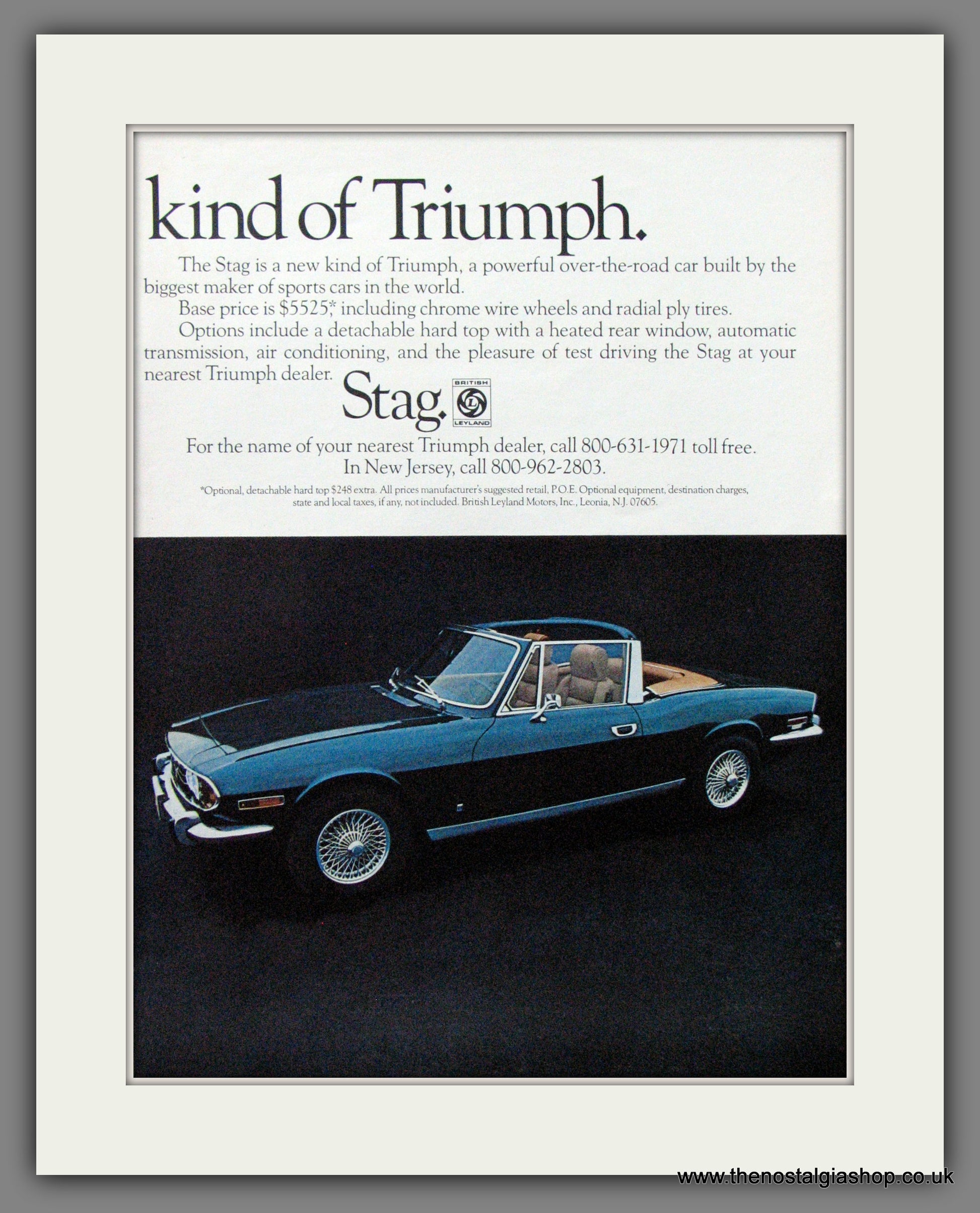 Triumph Stag. Vintage Advert. Large A3 in two halves, Classic Original American advert 1971. Presented and Supplied in 2 cream bevel cut mounts, Each mount is 14 x 11 inches with backing card and clear bag. Ready to frame. Want them framing? If so, buy this then go to Frames Available Category. Click to buy on the suitable frame and we will do the rest. All our adverts, unless clearly stated are Originals from the date shown They make excellent pieces of wall art and stunning gifts. Many are rare and hard to find and once sold, may not be replaced. Remember you are buying a piece of history. Website watermark is not on original.