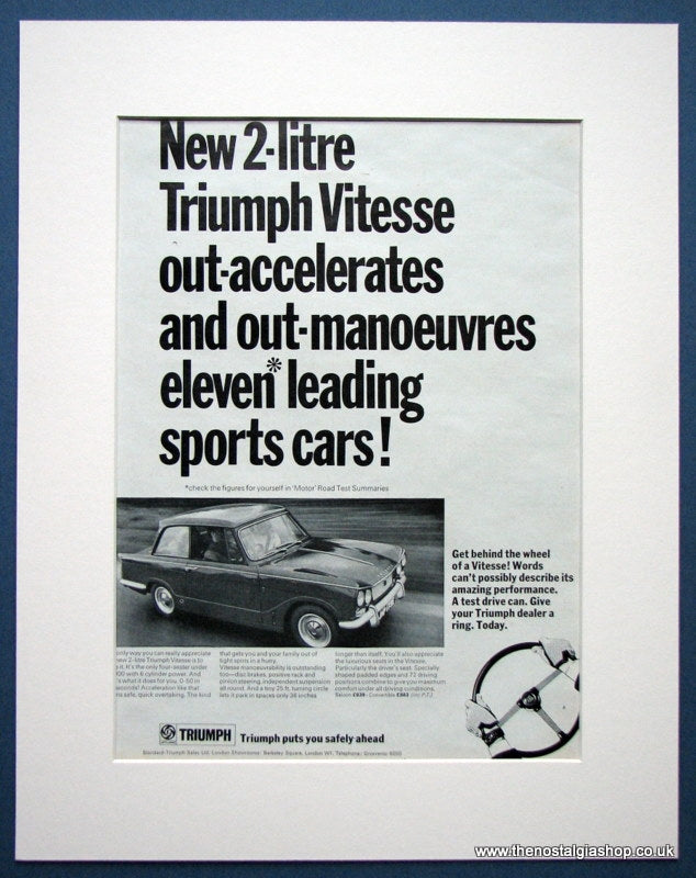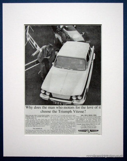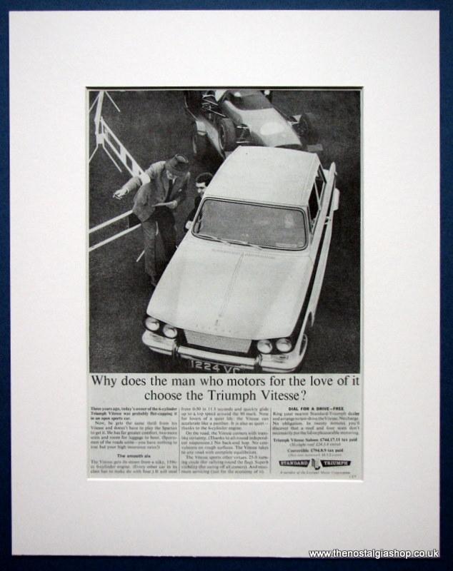 Triumph Vitesse. Get behind the wheel of a Vitesse 2 x Classic original adverts 1964 & 1967. (price is for both adverts) Presented in cream bevel cut mounts with backing card. Each is ready to fit in 14 x 11 inch frame. Want them framing? If so, buy this then go to Frames Available Category. Click to buy on the suitable frame(s) and we will do the rest. All our adverts, unless clearly stated are Originals from the date shown They make excellent pieces of wall art and stunning gifts. Many are rare and hard to find and once sold, may not be replaced. Remember you are buying a piece of history. Website watermark is not on original.