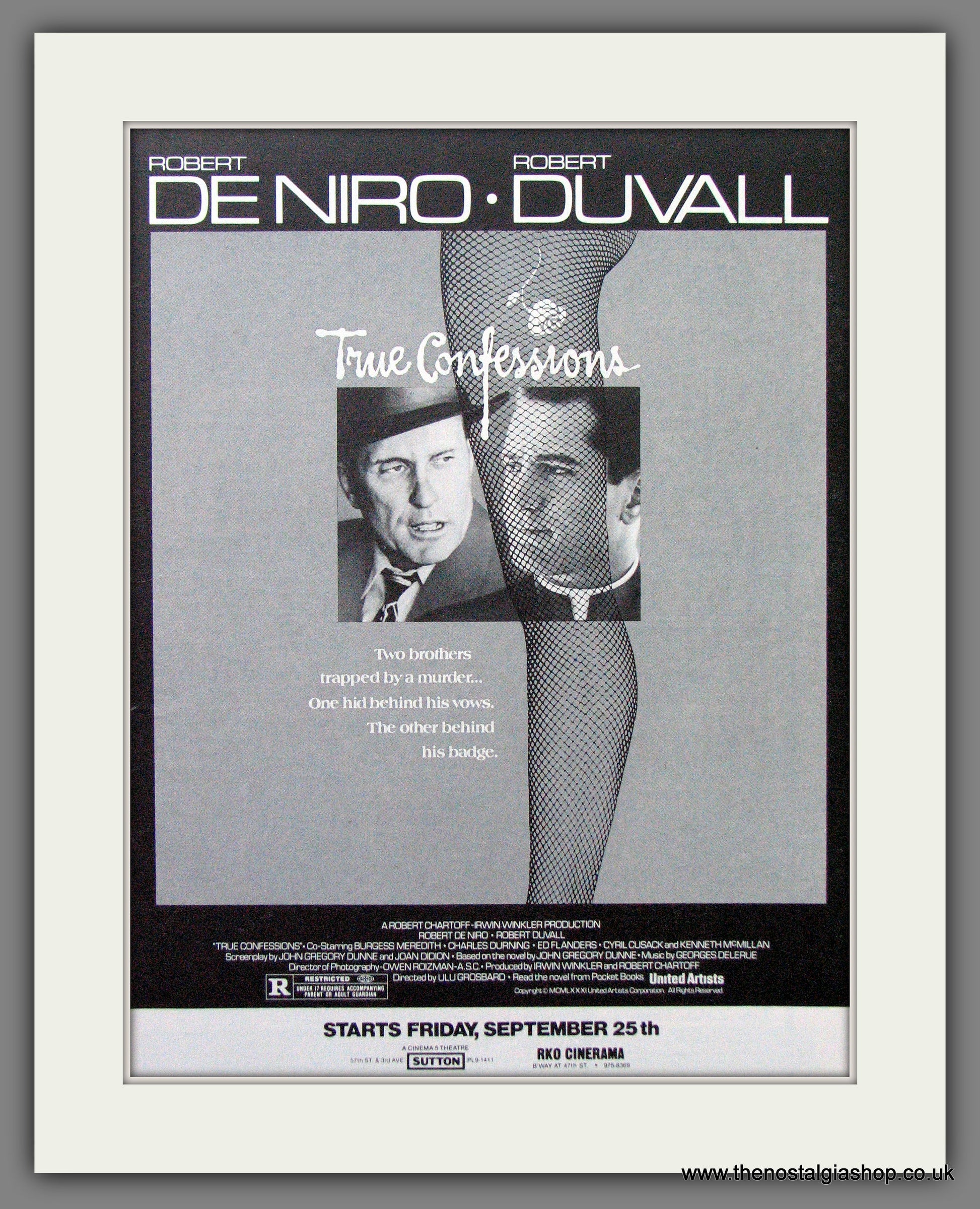 True Confessions. Robert De Niro, Robert Duvall. Vintage Advert. Classic Original advert 1981. Presented and Supplied in a cream bevel cut mount with backing card and display bag. Ready to fit in 14 x 11 inch frame. Want it framing? If so, buy this then go to Frames Available Category. Click to buy on the suitable frame and we will do the rest. All our adverts, unless clearly stated are Originals from the date shown. They make excellent pieces of wall art and stunning gifts. Many are rare and hard to find and once sold, may not be replaced. Remember you are buying a piece of history. Website watermark is not on original.