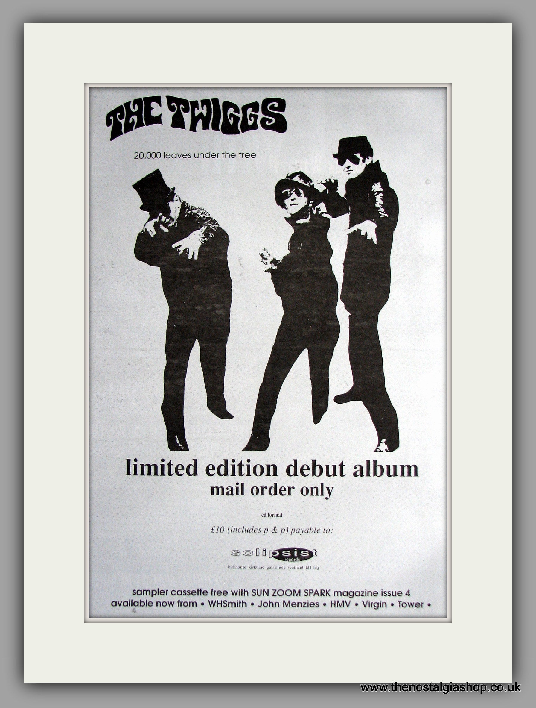 Twiggs (The) - Debut Album. Original Vintage Advert 1994 (ref AD11139). Presented and supplied in a cream bevel cut mount with backing card and clear bag. Ready to fit in a 20x16 inch frame. The mounted advert will be posted via courier and well packed - protected with a sheet of hardboard to keep it rigid. Any questions or enquiries, please get in touch, we are here to help! All our adverts, unless clearly stated are originals from the date shown. They make excellent pieces of wall art and stunning gifts. Many are rare and hard to find and once sold, may not be replaced. Remember you are buying a piece of history. Website watermark is not on original.
