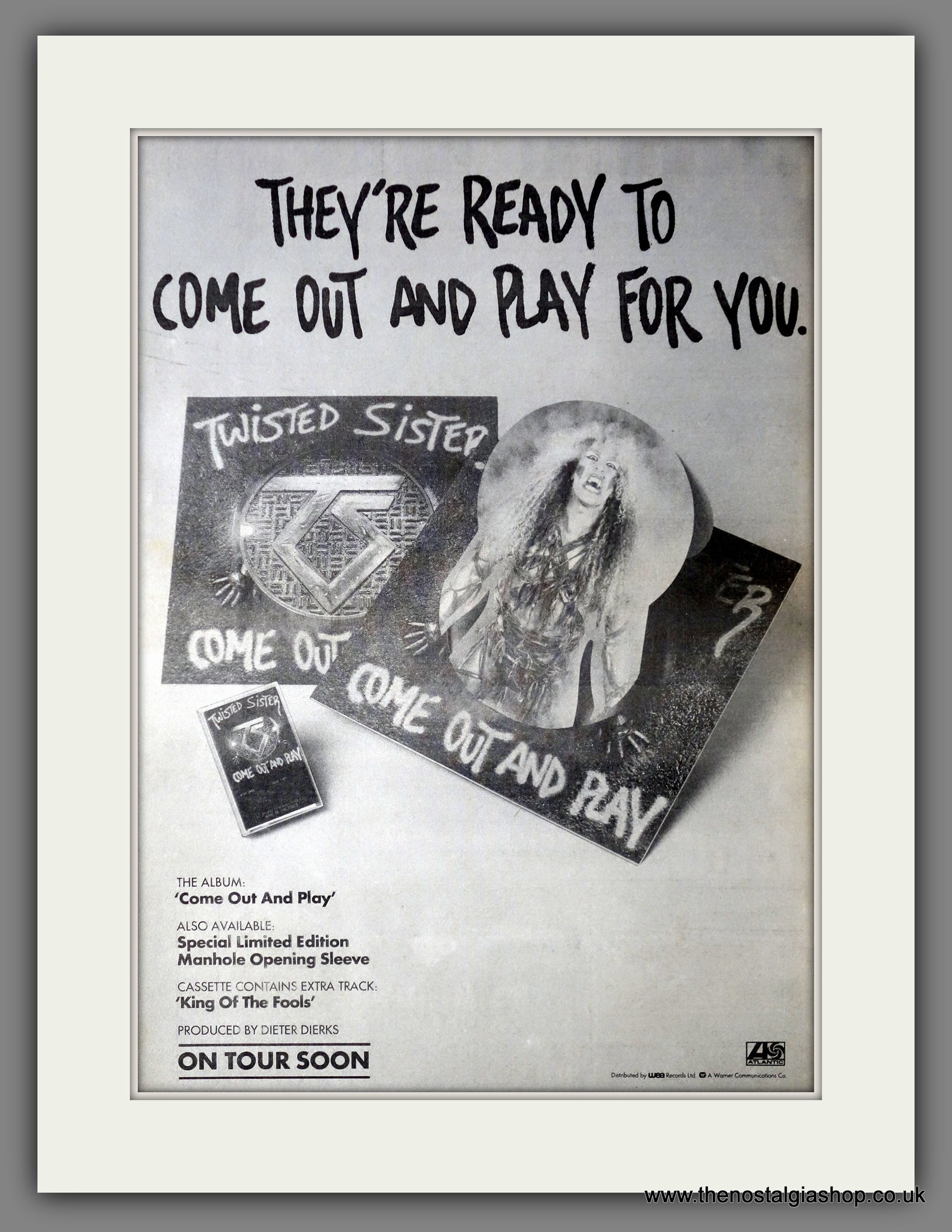 Twisted Sister. Come Out And Play. Vintage Advert. This is a large classic Original advert 1985. Presented in cream bevel cut mount with backing card and clear bag. Ready to fit in 20 x 16 inch frame. The mounted advert will be posted via courier and well packed - protected with a sheet of hardboard to keep it rigid. Any questions or inquiries, please get in touch, we are here to help! All our adverts, unless clearly stated are Originals from the date shown. They make excellent pieces of wall art and stunning gifts. Many are rare and hard to find and once sold, may not be replaced. Remember you are buying a piece of history. Website watermark is not on original.