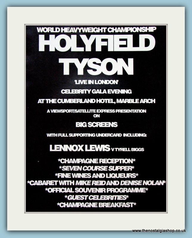 Evander Holyfield v Mike Tyson. Ceasars Palace, Las Vegas, Plus undercard featuring Lennox Lewis.Set of 2 classic original adverts 1991. (price is for both ads) Each is presented in cream bevel cut mount with backing card and clear bag. Each is ready to fit in 14 x 11 inch frame. Want then framing? If so, buy these then go to Frames Available Category. Click to buy on the suitable frame(s) and we will do the rest. All our adverts, unless clearly stated are Originals from the date shown They make excellent pieces of wall art and stunning gifts. Many are rare and hard to find and once sold, may not be replaced. Remember you are buying a piece of history. Website watermark is not on original.