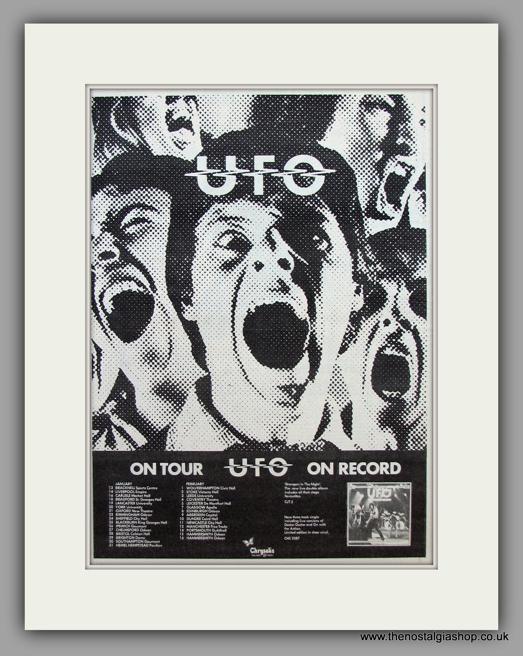 UFO On Tour. Vintage Advert. This is a large classic Original advert 1979. Presented in cream bevel cut mount with backing card and clear bag. Ready to fit in 20 x 16 inch frame. The mounted advert will be posted via courier and well packed - protected with a sheet of hardboard to keep it rigid. Any questions or inquiries, please get in touch, we are here to help! All our adverts, unless clearly stated are Originals from the date shown. They make excellent pieces of wall art and stunning gifts. Many are rare and hard to find and once sold, may not be replaced. Remember you are buying a piece of history. Website watermark is not on original.
