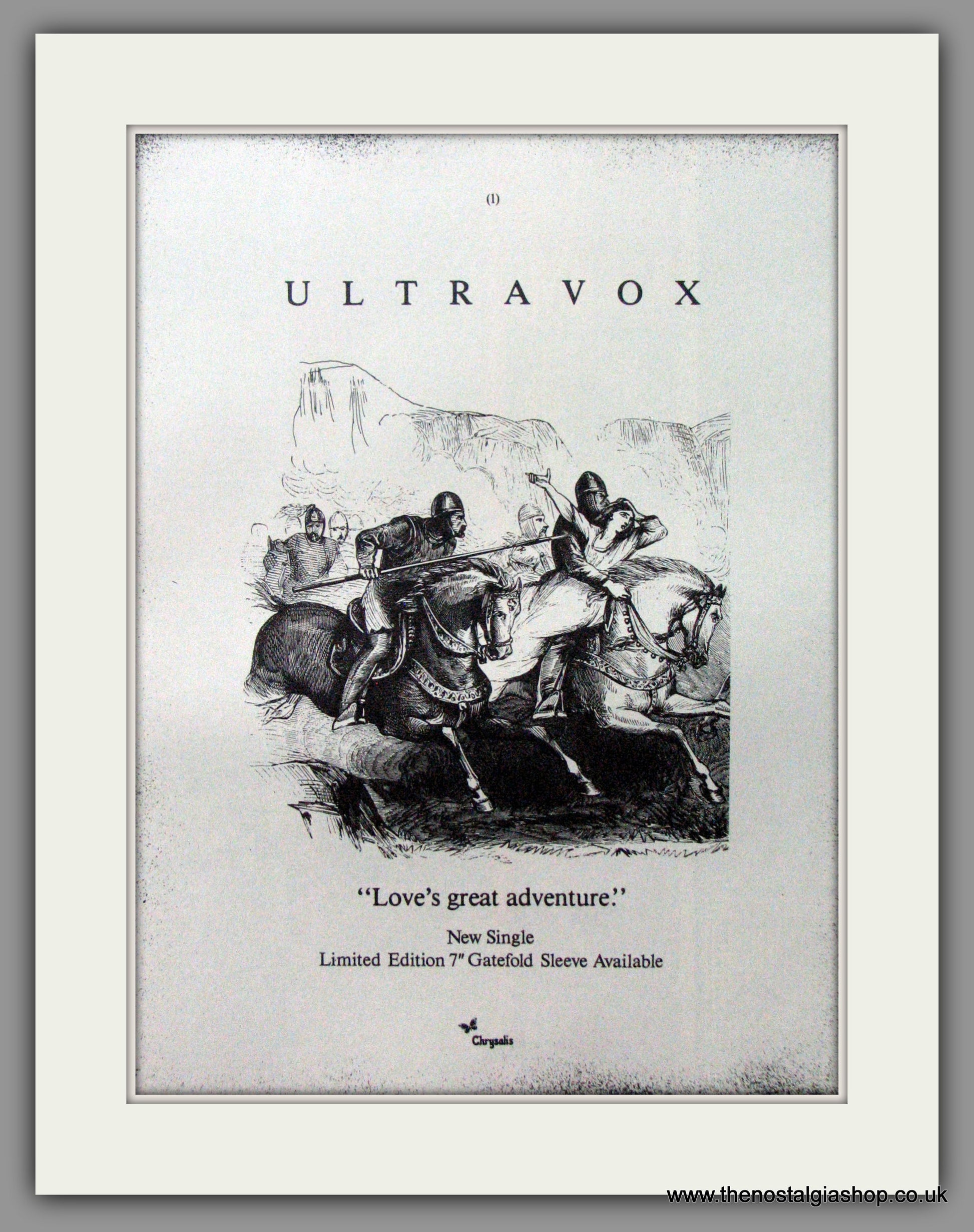 Ultravox. Love's Great Adventure. Classic Original advert 1984. Presented and Supplied in cream bevel cut mount with backing card and clear bag. Ready to fit in 14 x 11 inch frame. Want it framing? If so, buy this then go to Frames Available Category. Click to buy on the suitable frame and we will do the rest. All our adverts, unless clearly stated are Originals from the date shown. They make excellent pieces of wall art and stunning gifts. Many are rare and hard to find and once sold, may not be replaced. Remember you are buying a piece of history. Website watermark is not on original.