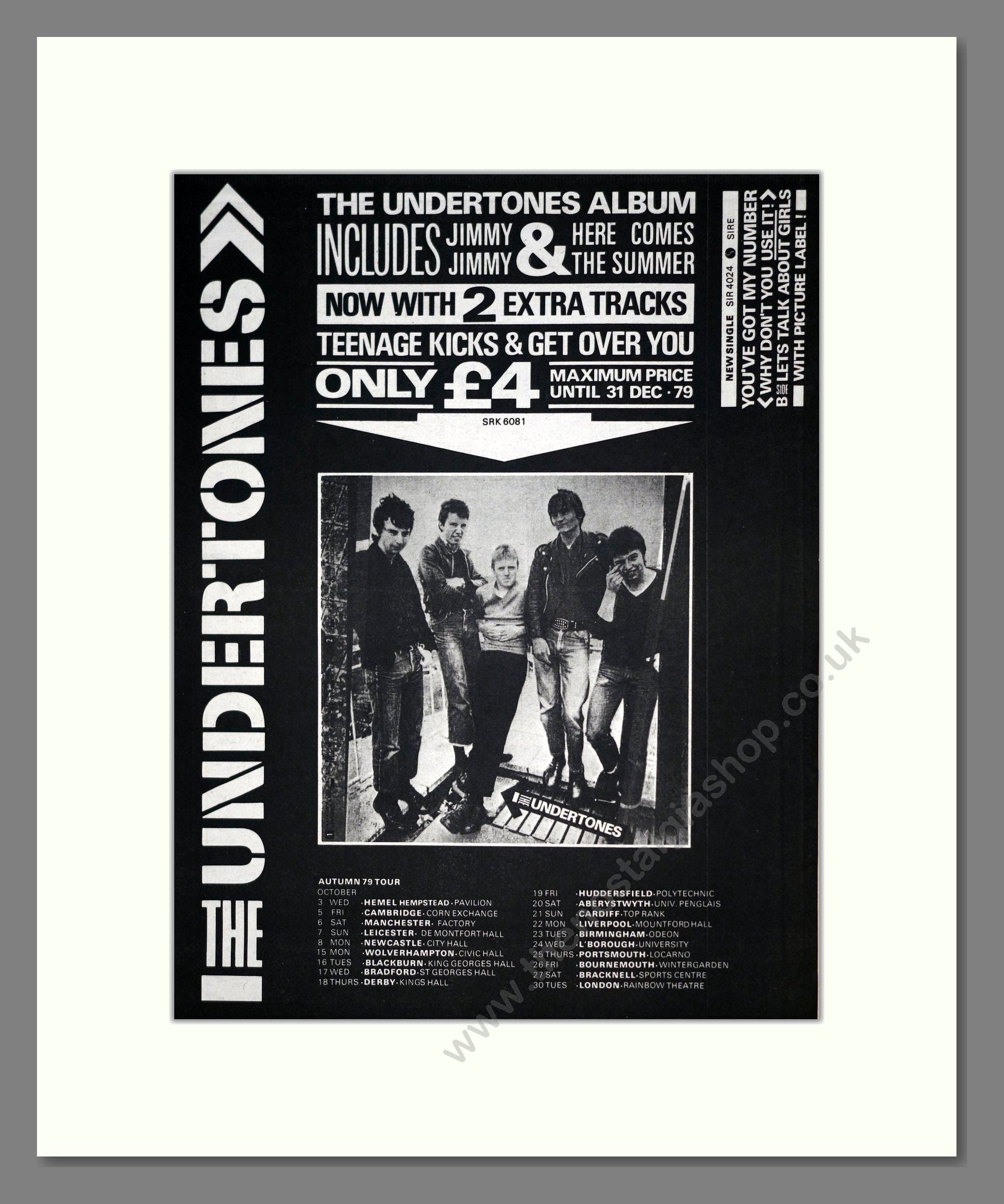 Undertones (The) - UK Tour. Vintage Advert. This is a large classic original advert from 1979. Presented and supplied in a cream bevel cut mount with backing card and clear bag. Ready to fit in a 20 x 16 inches frame. The mounted advert will be posted via courier and well packed - protected with a sheet of hardboard to keep it rigid. Any questions or enquiries, please get in touch, we are here to help! All our adverts, unless clearly stated are originals from the date shown. They make excellent pieces of wall art and stunning gifts. Many are rare and hard to find and once sold, may not be replaced. Remember you are buying a piece of history. Website watermark is not on original.