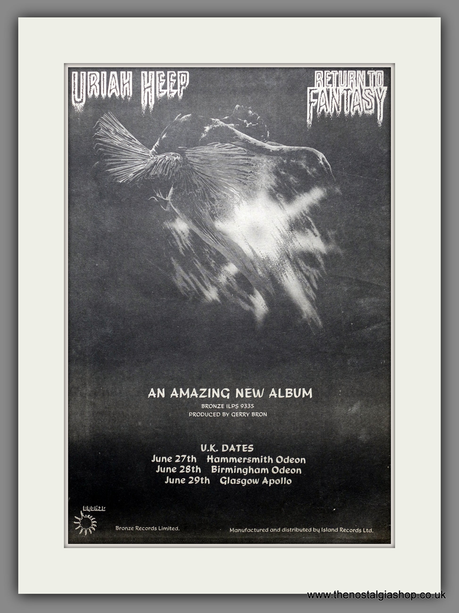Uriah Heep Return To Fantasy. This is a large classic Original Vintage Advert 1975. Presented and Supplied in a cream, bevel cut mount with backing card and clear bag. Ready to fit in 20 x 16 inch frame. The mounted advert will be posted via courier and well packed - protected with a sheet of hardboard to keep it rigid. Any questions or inquiries, please get in touch, we are here to help! All our adverts, unless clearly stated are Originals from the date shown. They make excellent pieces of wall art and stunning gifts. Many are rare and hard to find and once sold, may not be replaced. Remember you are buying a piece of history. Website watermark is not on original.