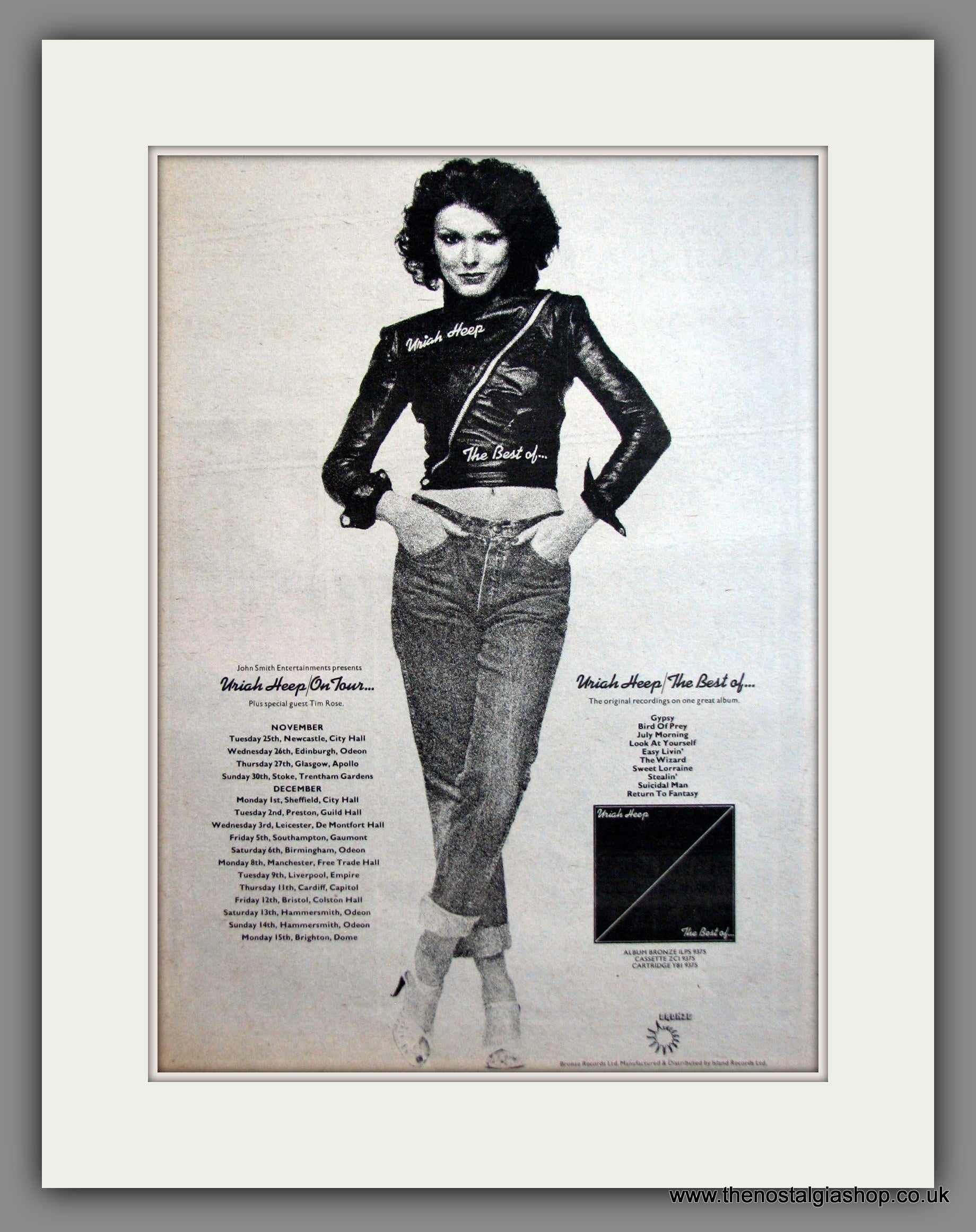 Uriah Heep, UK Tour Dates. Original Advert 1975 (ref AD11915). Presented and supplied in a cream bevel cut mount with backing card and clear bag. Ready to fit in a 20x16 inch frame. The mounted advert will be posted via courier and well packed - protected with a sheet of hardboard to keep it rigid. Any questions or enquiries, please get in touch, we are here to help! All our adverts, unless clearly stated are originals from the date shown. They make excellent pieces of wall art and stunning gifts. Many are rare and hard to find and once sold, may not be replaced. Remember you are buying a piece of history. Website watermark is not on original.
