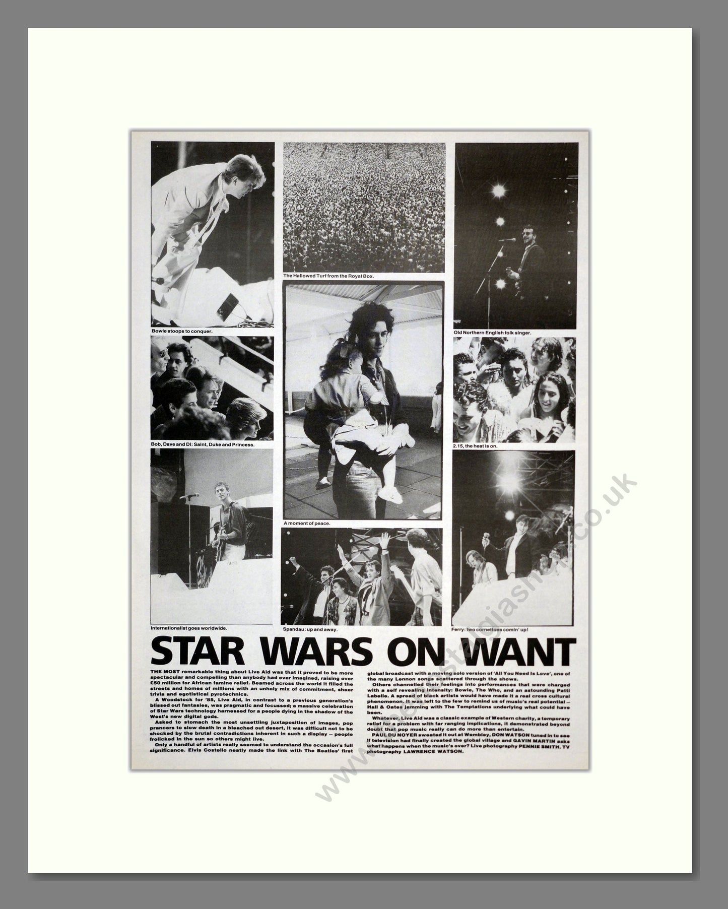 Various Artists - Live Aid Images. Vintage Advert. This is a large classic original advert from 1985. Presented and supplied in a cream bevel cut mount with backing card and clear bag. Ready to fit in a 20 x 16 inches frame. The mounted advert will be posted via courier and well packed - protected with a sheet of hardboard to keep it rigid. Any questions or enquiries, please get in touch, we are here to help! All our adverts, unless clearly stated are originals from the date shown. They make excellent pieces of wall art and stunning gifts. Many are rare and hard to find and once sold, may not be replaced. Remember you are buying a piece of history. Website watermark is not on original.