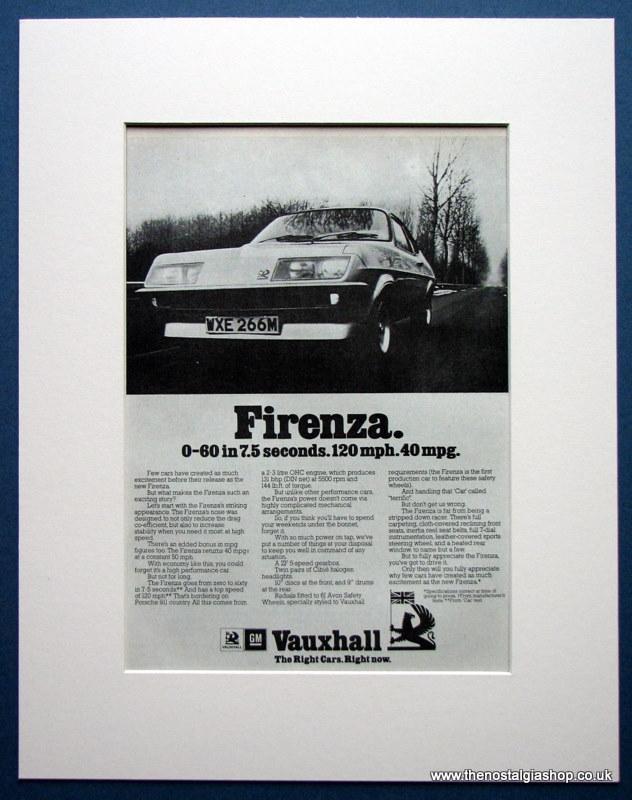 Vauxhall Firenza 0-60 in 7.5 seconds, 120 mph, 40 mpg Classic original adverts 1974 (Price is for both adverts) Presented in 2 cream bevel cut mounts with backing card and clear bags. Ready to frame. All our adverts, unless clearly stated are Originals from the date shown They make excellent pieces of wall art and stunning gifts. Many are rare and hard to find and once sold, may not be replaced. Remember you are buying a piece of history. Website watermark is not on original.