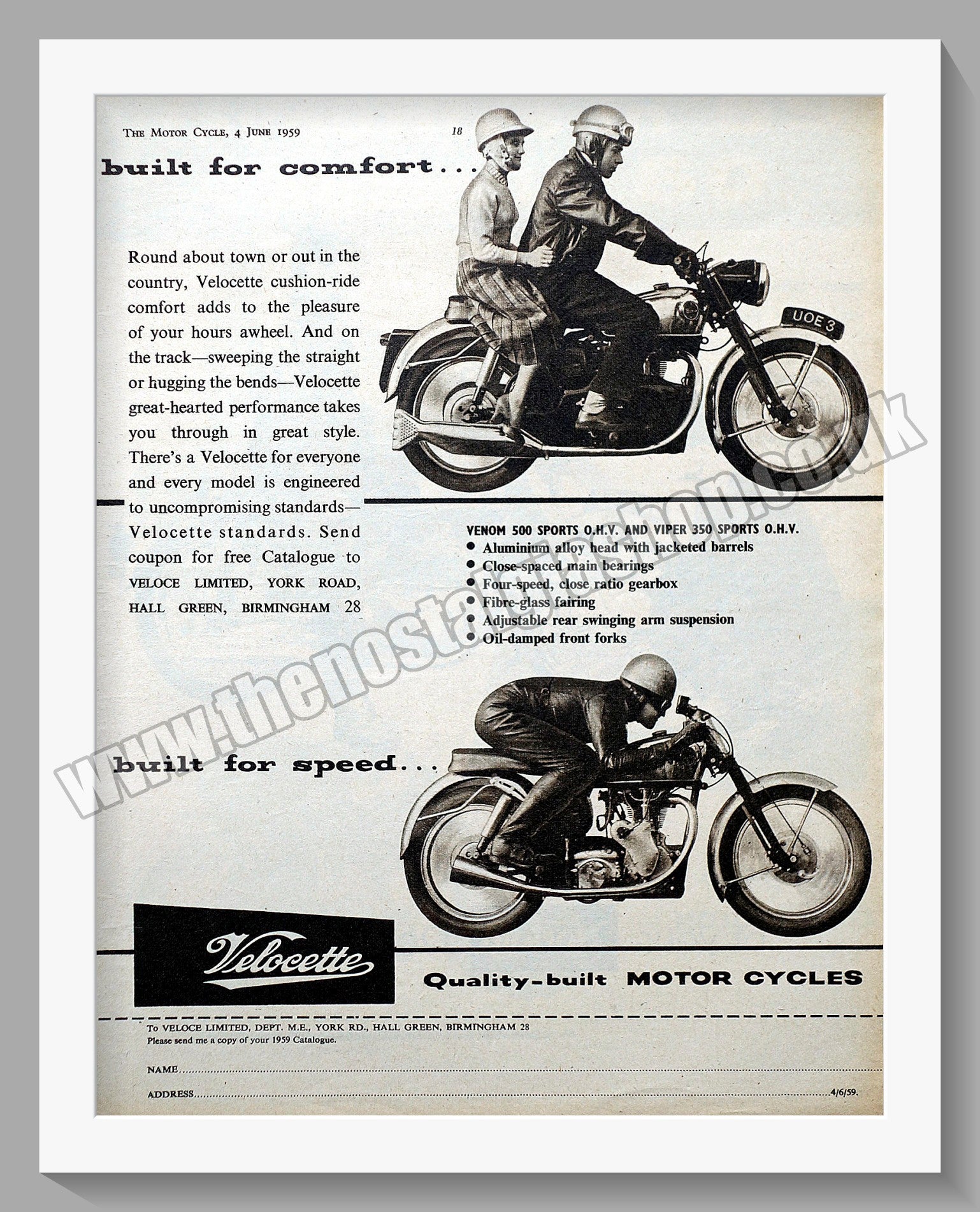 Velocette Venom and Viper Motor Cycles. Original Vintage Advert from 1959. Presented and Supplied in a cream bevel cut mount with backing board and Clear Bag. Made to fit straight into 14x11 inch frame. The perfect gift.- These adverts are all taken from Original publications of the dates stated. They are NOT modern reprints. Many are difficult to get hold of , some are very rare and once sold may not be replaced, Remember, you are buying a piece of historic nostalgia. Please contact us if you don't see the advert you want. Website Watermark is not on product. Velocette Motor Cycles. Veloce Limited.