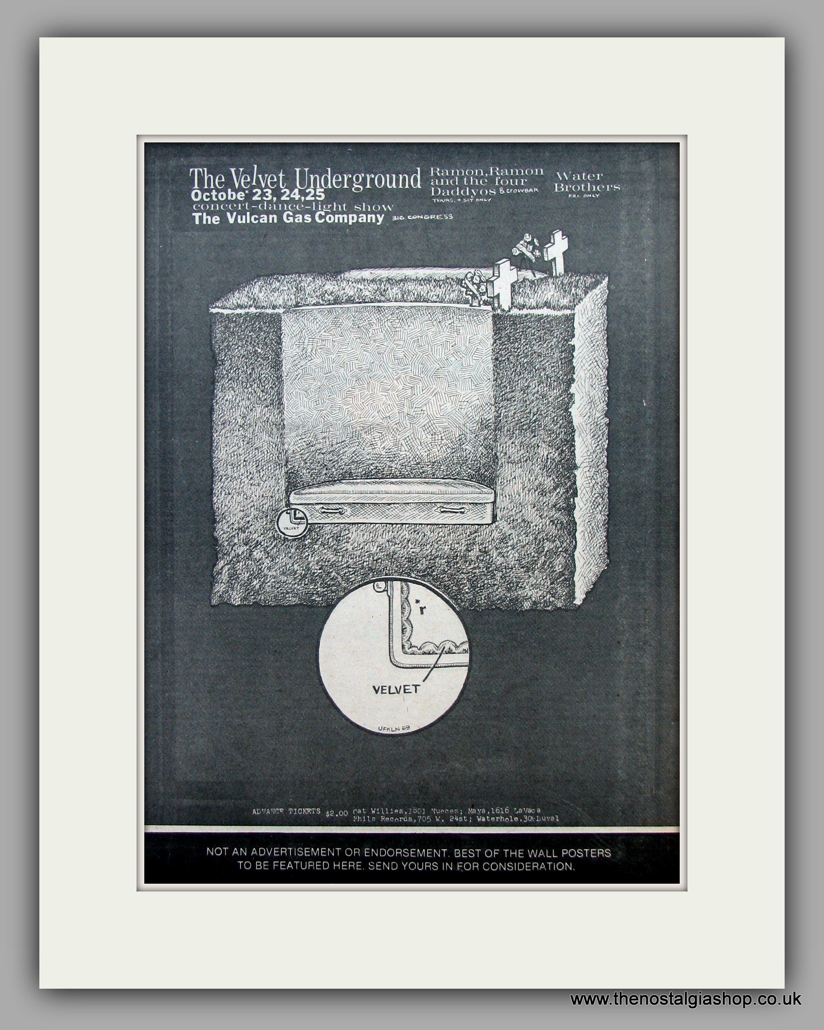 Velvet Underground (The). Original Vintage Advert 1980 (ref AD10382). Presented and supplied in a cream bevel cut mount with backing card and clear bag. Ready to fit in a 20x16 inch frame. The mounted advert will be posted via courier and well packed - protected with a sheet of hardboard to keep it rigid. Any questions or enquiries, please get in touch, we are here to help! All our adverts, unless clearly stated are originals from the date shown. They make excellent pieces of wall art and stunning gifts. Many are rare and hard to find and once sold, may not be replaced. Remember you are buying a piece of history. Website watermark is not on original.