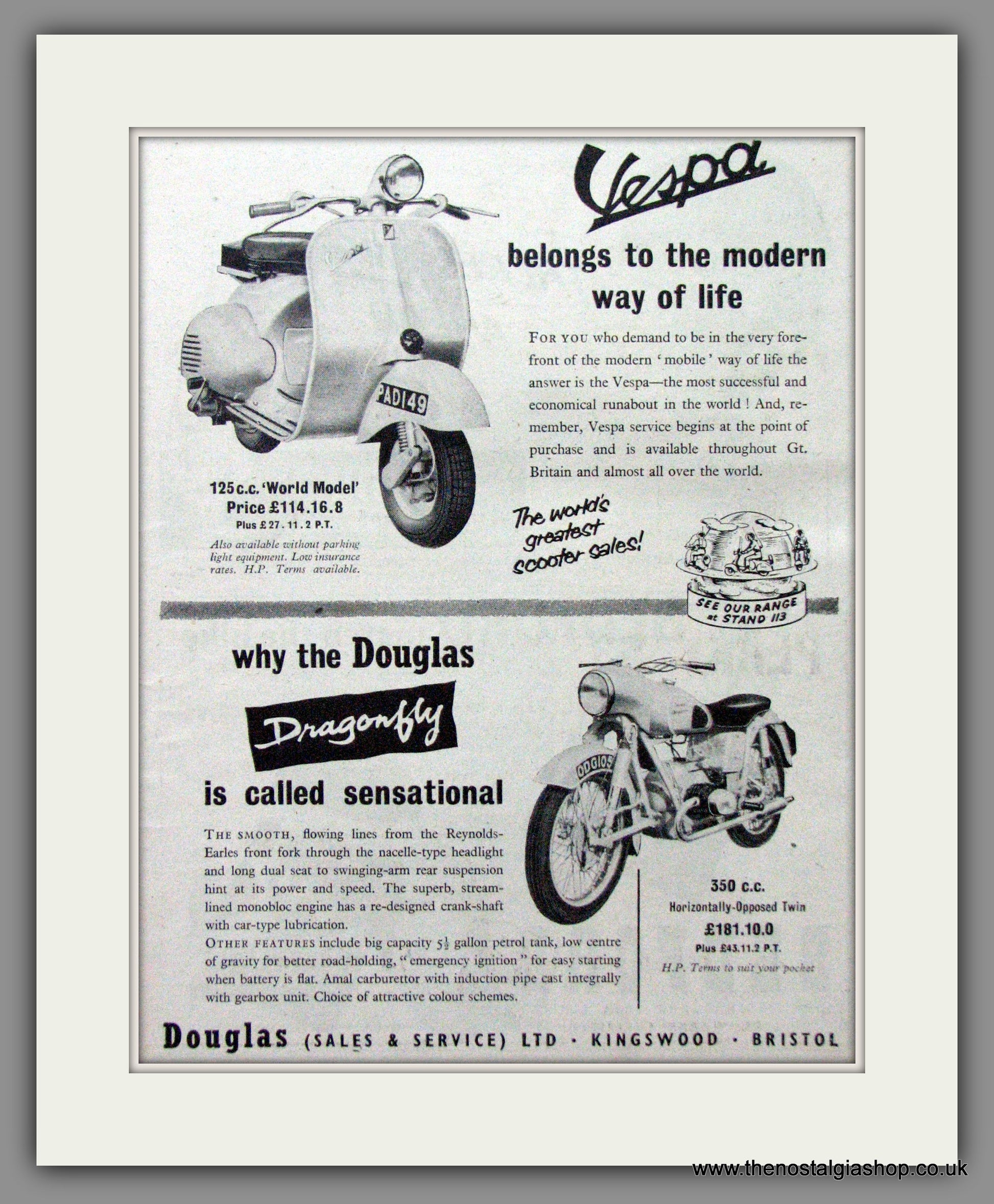 Vespa 125cc and Douglass Dragonfly. Original advert 1955 (ref AD52484)