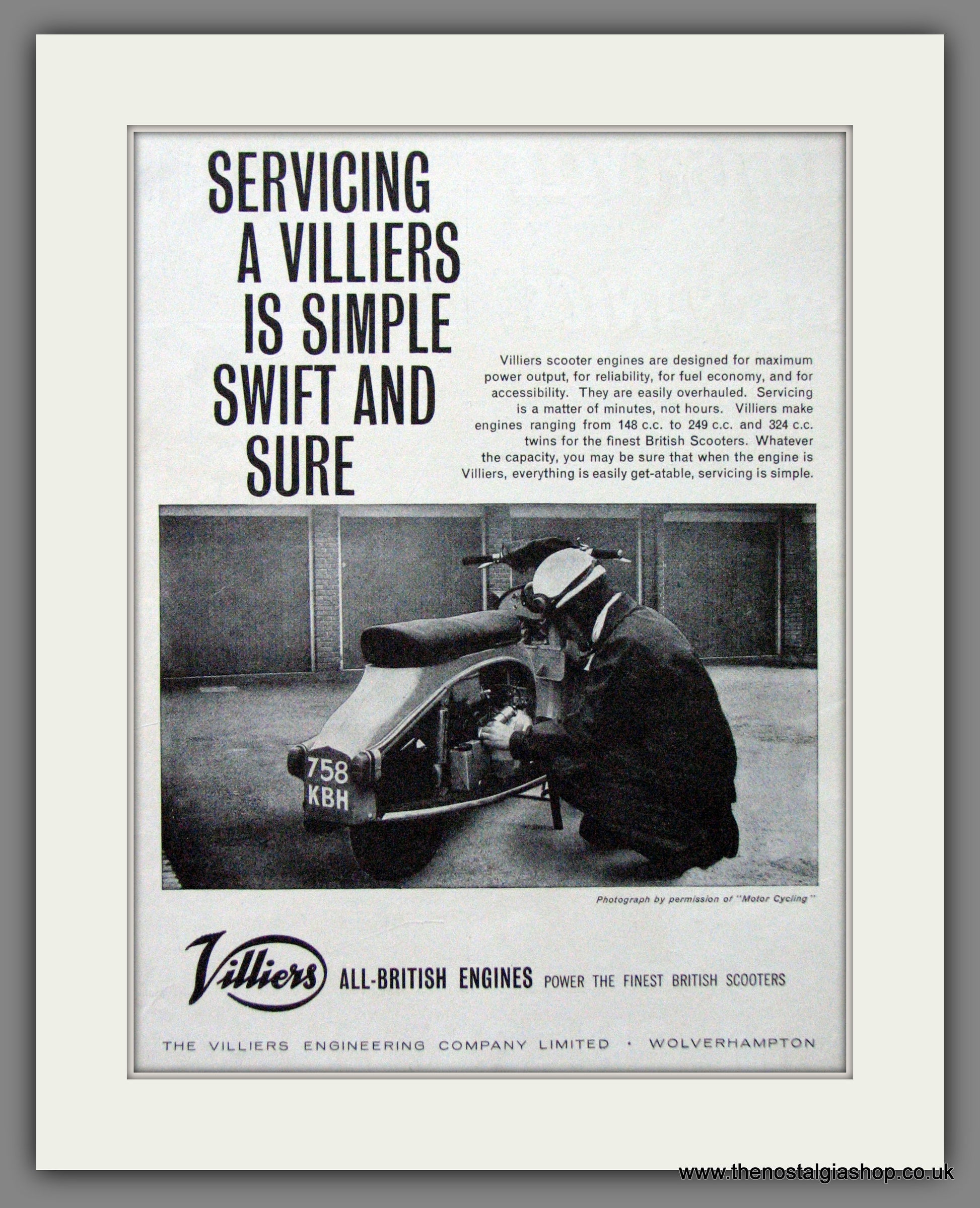 Villiers Engines For British Scooters. Vintage Original Advert from 1961. Presented and Supplied in cream bevel cut mount with backing board and clear bag. Made to fit straight into 14 by 11 inch frame. (Available in separate category if required) All our Adverts, unless clearly stated are Original and from the year shown. They are NOT modern reprints. Many are difficult to get hold of , some are very rare and once sold may not be replaced, Remember, you are buying a piece of historic nostalgia. Lots more adverts available. Please contact us if you don't see the advert you want. Scooters. Mods.