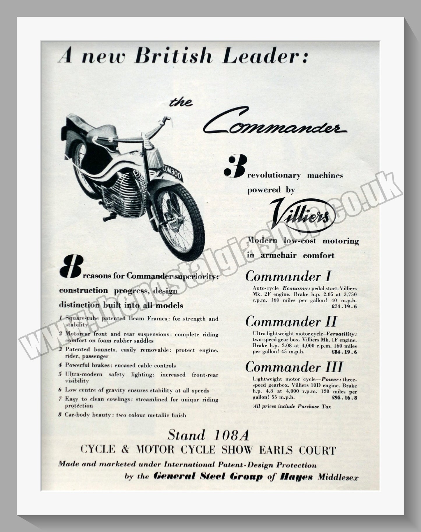 Villiers Engine in the Commander. Vintage Original Advert 1952. Presented and Supplied in a 14 x 11 Inch, Inch cream bevel cut mount with backing card and clear bag. Ready to frame. All our adverts, unless clearly stated are Originals from the date shown. They make excellent pieces of wall art and stunning gifts Many are rare and hard to find and once sold, may not be replaced. Remember you are buying a piece of history. Website watermark is not present on the product. The Villiers Engineering Co. Ltd Wolverhampton.