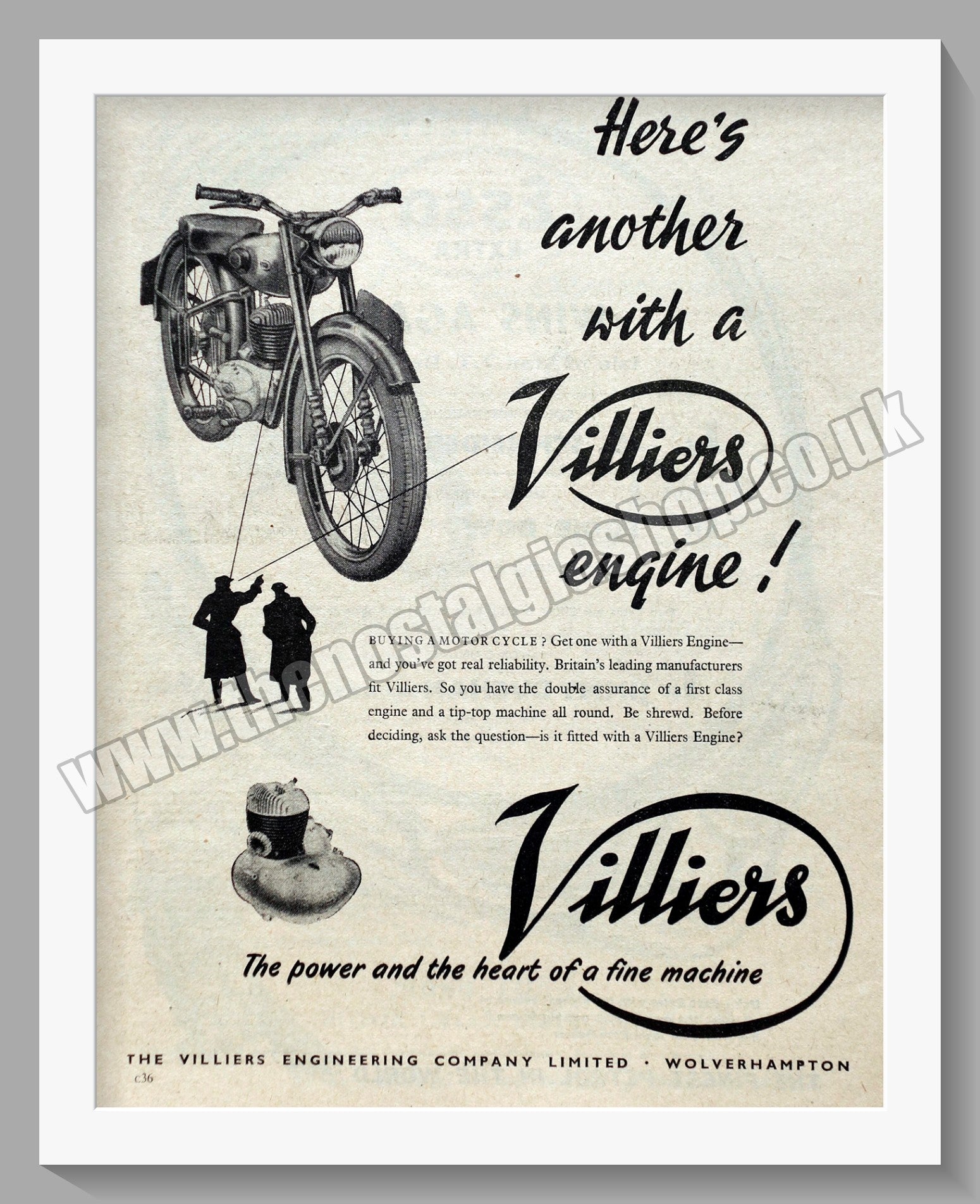 Villiers Engine. Vintage Original Advert 1955. Presented and Supplied in a 14 x 11 Inch, Inch cream bevel cut mount with backing card and clear bag. Ready to frame. All our adverts, unless clearly stated are Originals from the date shown. They make excellent pieces of wall art and stunning gifts Many are rare and hard to find and once sold, may not be replaced. Remember you are buying a piece of history. Website watermark is not present on the product. The Villiers Engineering Co. Ltd Wolverhampton.