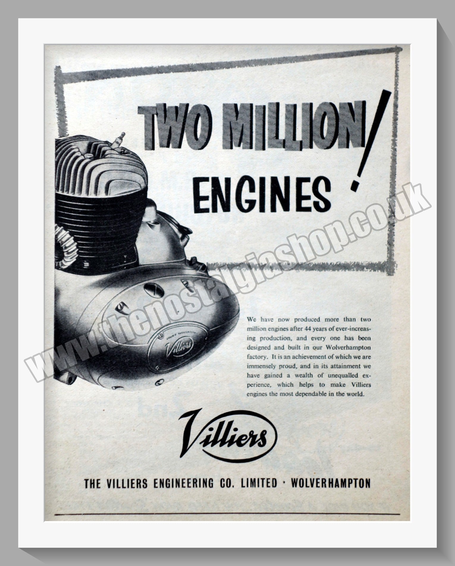 Villiers Engine. Vintage Original Advert 1956. Presented and Supplied in a 14 x 11 Inch, Inch cream bevel cut mount with backing card and clear bag. Ready to frame. All our adverts, unless clearly stated are Originals from the date shown. They make excellent pieces of wall art and stunning gifts Many are rare and hard to find and once sold, may not be replaced. Remember you are buying a piece of history. Website watermark is not present on the product. The Villiers Engineering Co. Ltd Wolverhampton.