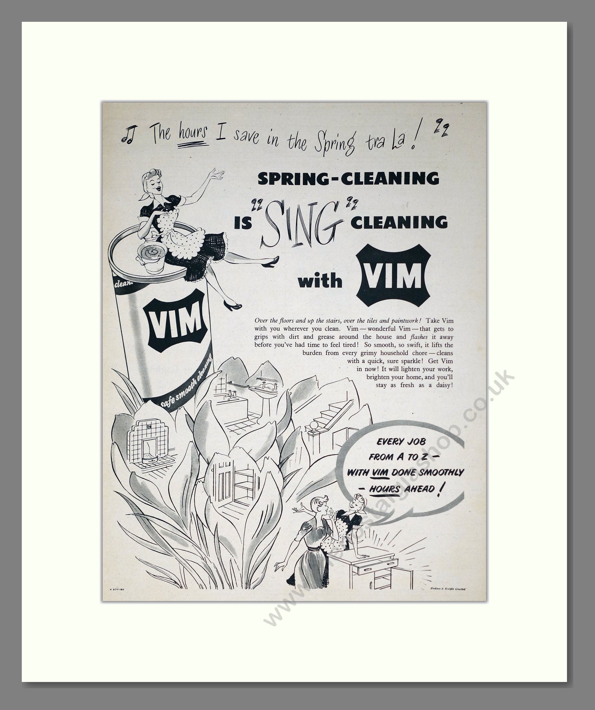 Vim - Spring Cleaning. Vintage Advert. This is a large classic original advert from 1951. Presented and supplied in a cream bevel cut mount with backing card and clear bag. Ready to fit in a 18 x 14 inches frame. The mounted advert will be posted via courier and well packed - protected with a sheet of hardboard to keep it rigid. Any questions or enquiries, please get in touch, we are here to help! All our adverts, unless clearly stated are originals from the date shown. They make excellent pieces of wall art and stunning gifts. Many are rare and hard to find and once sold, may not be replaced. Remember you are buying a piece of history. Website watermark is not on original.
