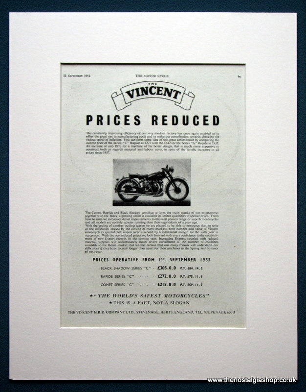 Vincent Prices Reduced, Comet from £215! Classic original advert 1952. Presented in cream bevel cut mount with backing card. Ready to fit in 14 x 11 inch frame. Want it framing? If so, buy this then go to Frames Available Category. Click to buy on the suitable frame and we will do the rest. All our adverts, unless clearly stated are Originals from the date shown They make excellent pieces of wall art and stunning gifts. Many are rare and hard to find and once sold, may not be replaced. Remember you are buying a piece of history. Website watermark is not on original.