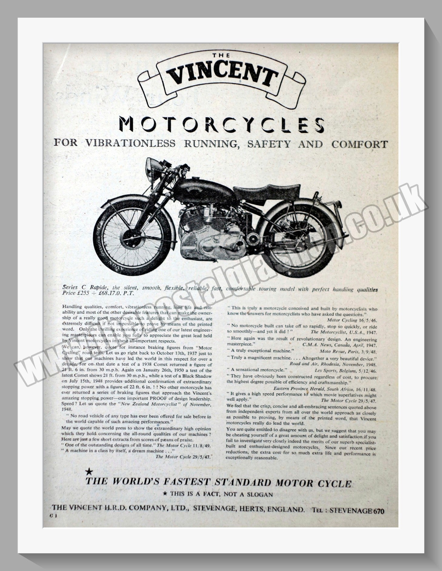 Vincent Motor Cycles. Vincent Series C Rapide. Vintage Original Advert 1950 Presented and Supplied in 14 x 11 Inch cream bevel cut mount with backing card and Clear Bag. Ready to frame. All our adverts, unless clearly stated are Originals from the date shown. They make excellent pieces of wall art and stunning gifts Many are rare and hard to find and once sold, may not be replaced. Remember you are buying a piece of history. Website watermark is not present on the product. Vincent Motorcycles.