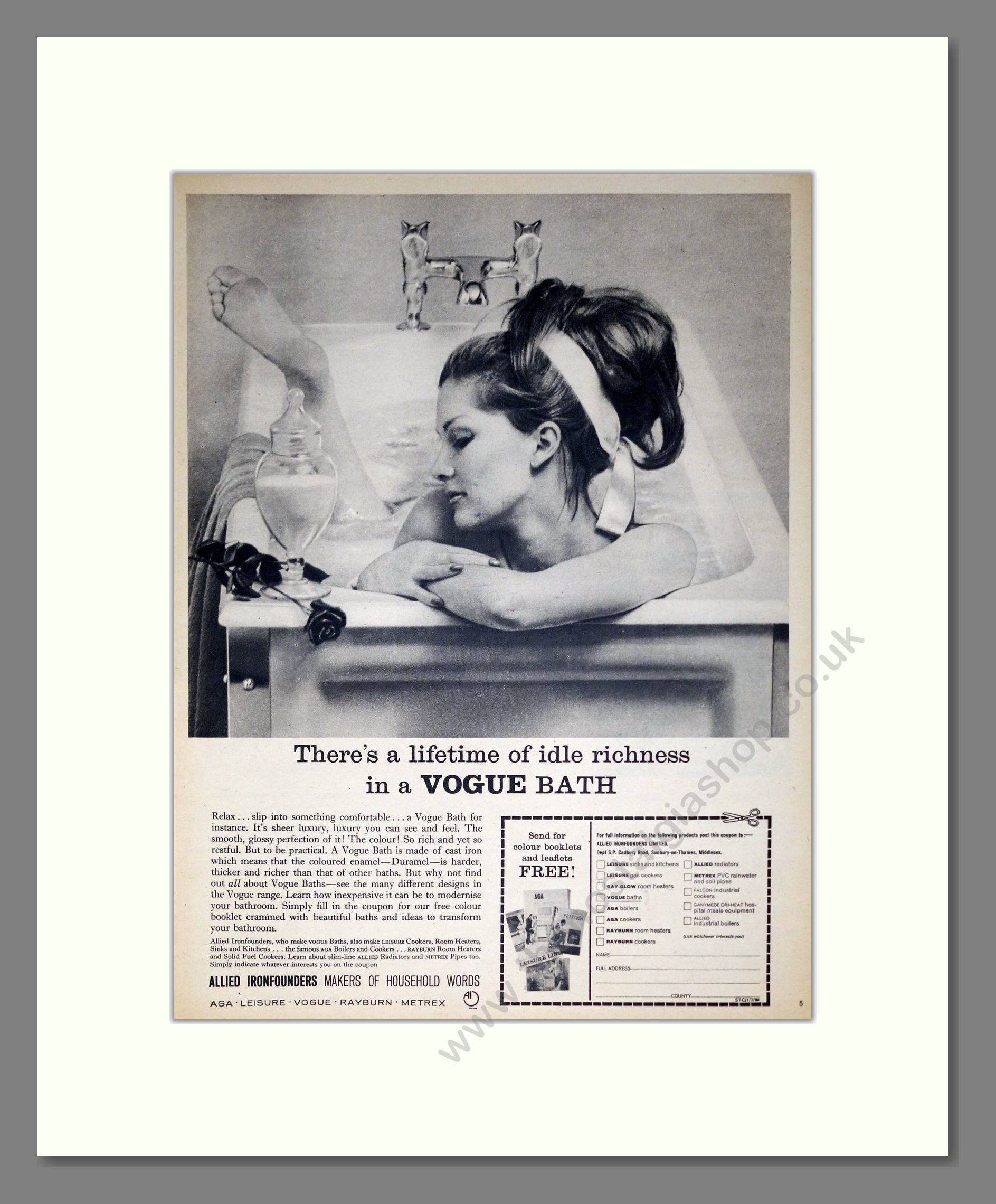 Vogue - Baths. Vintage Advert. This is a large classic original advert from 1964. Presented and supplied in a cream bevel cut mount with backing card and clear bag. Ready to fit in a 18 x 14 inches frame. The mounted advert will be posted via courier and well packed - protected with a sheet of hardboard to keep it rigid. Any questions or enquiries, please get in touch, we are here to help! All our adverts, unless clearly stated are originals from the date shown. They make excellent pieces of wall art and stunning gifts. Many are rare and hard to find and once sold, may not be replaced. Remember you are buying a piece of history. Website watermark is not on original.