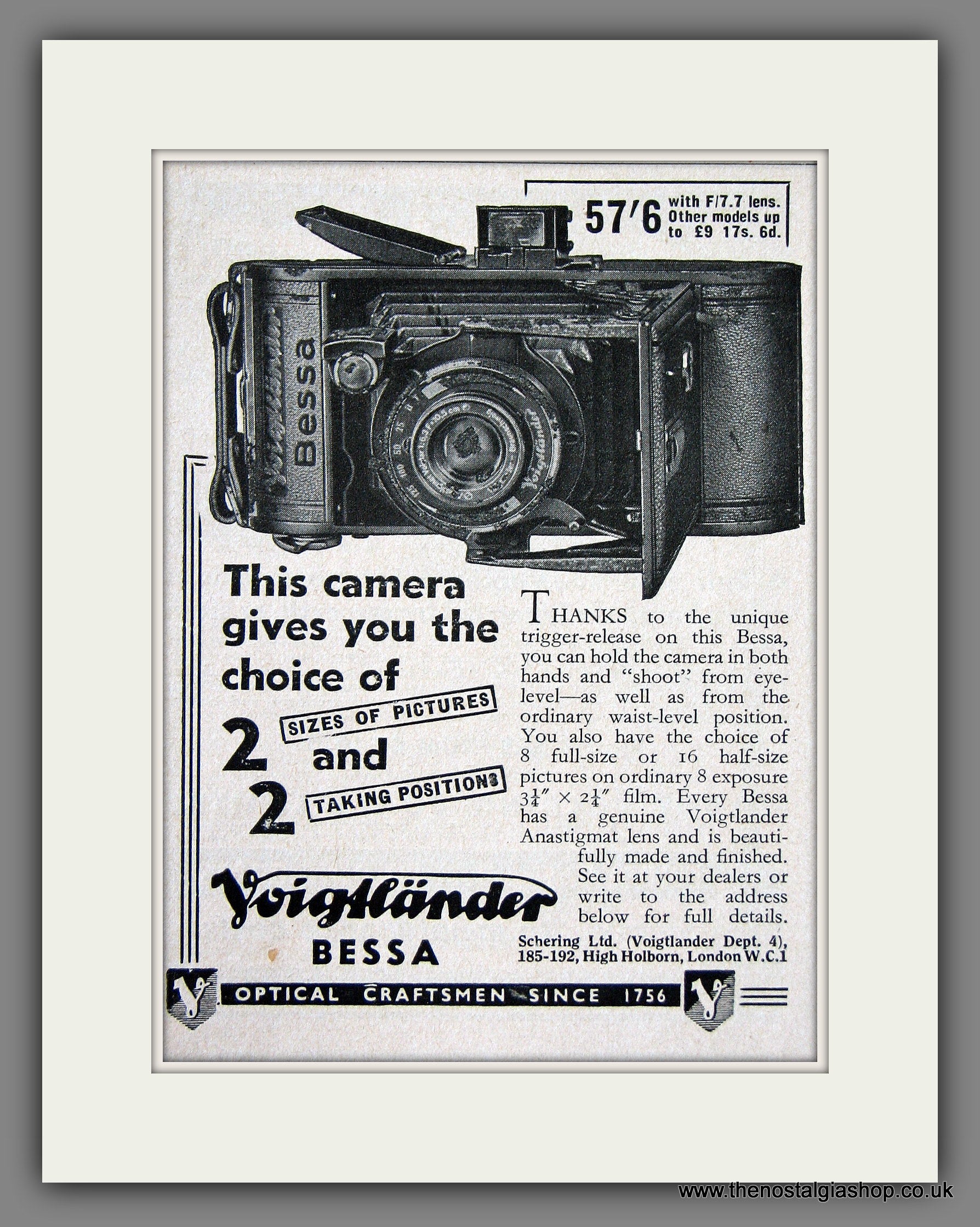 Voigtlander Bessa Camera. Vintage Advert. Classic Original advert 1939. Presented and Supplied in a cream bevel cut mount with backing card and clear bag. Ready to fit in 10 x 8 inch frame. Want it framing? If so, buy this then go to Frames Available Category. Click to buy on the suitable frame and we will do the rest. All our adverts, unless clearly stated are Originals from the date shown. They make excellent pieces of wall art and stunning gifts. Many are rare and hard to find and once sold, may not be replaced. Remember you are buying a piece of history. Website watermark is not on original.