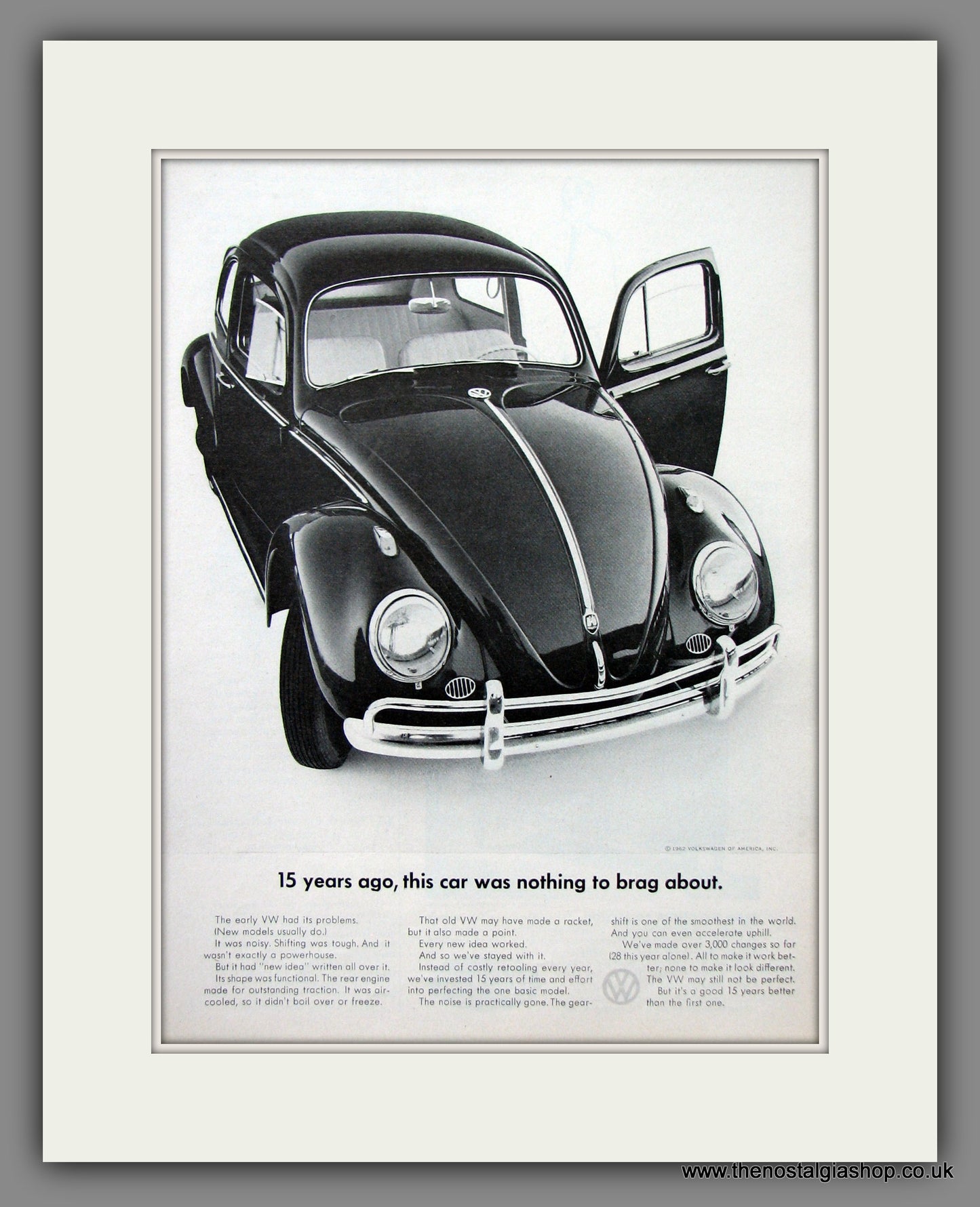 VW Beetle. Original American Advert 1962. Presented and Supplied in a cream bevel cut mount with backing card and clear bag. Ready to fit in 14 x 11 inch frame. Want it framing? If so, buy this then go to Frames Available Category. Click to buy on the suitable frame and we will do the rest. All our adverts, unless clearly stated are Originals from the date shown They make excellent pieces of wall art and stunning gifts. Many are rare and hard to find and once sold, may not be replaced. Remember you are buying a piece of history. Website watermark is not on original.