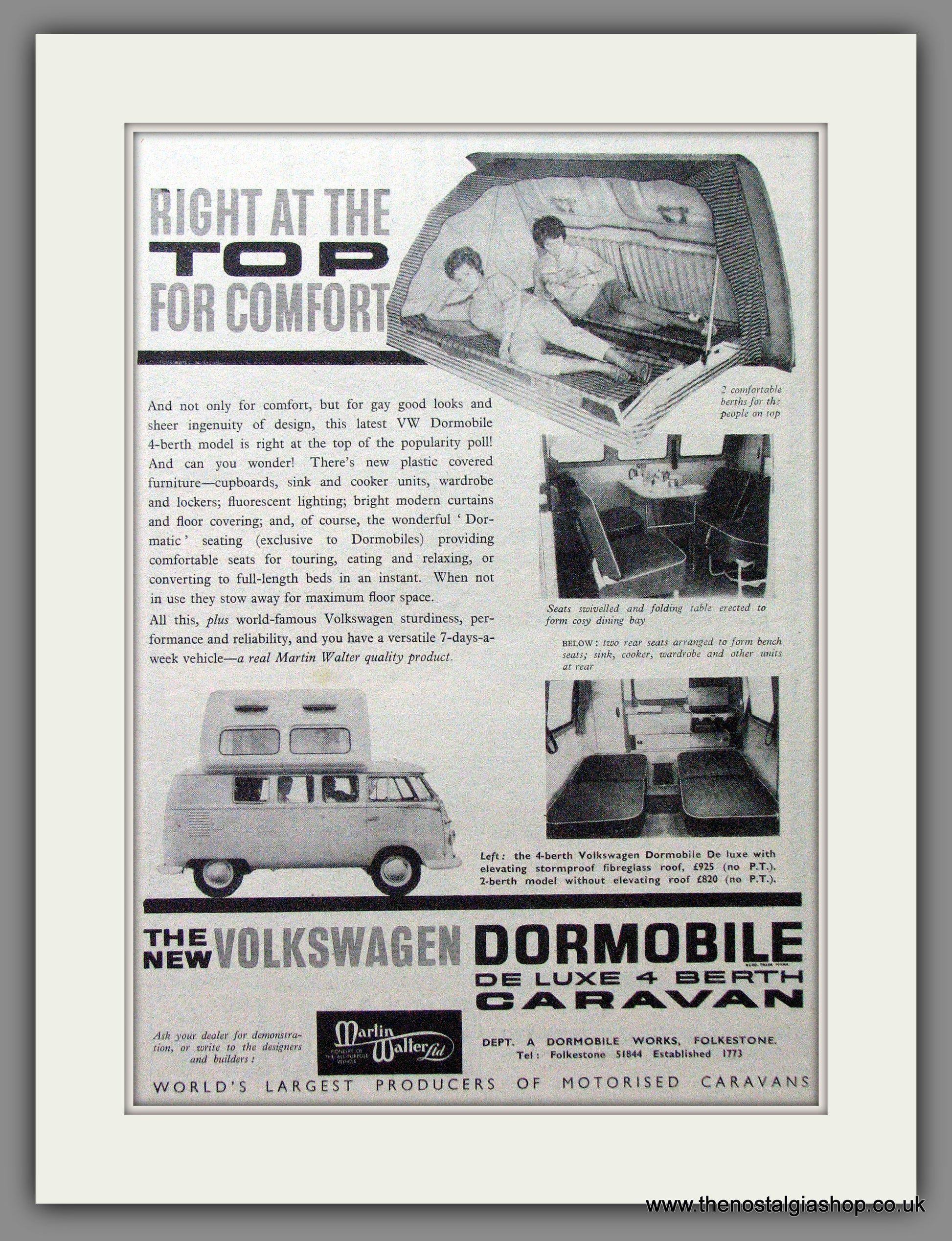 VW Motorised Caravan. VW Dormobile. Classic Original advert 1963. Presented and Supplied in a cream bevel cut mount with backing card and clear bag. Ready to fit in 14 x 11 inch frame. Want it framing? If so, buy this then go to Frames Available Category. Click to buy on the suitable frame and we will do the rest. All our adverts, unless clearly stated are Originals from the date shown. They make excellent pieces of wall art and stunning gifts. Many are rare and hard to find and once sold, may not be replaced. Remember you are buying a piece of history. Website watermark is not on original. Motorised Caravans, Motorhomes, Motor Homes, Campervans, Camper Van, Caravan. VW Campervan. VW Camper Van.
