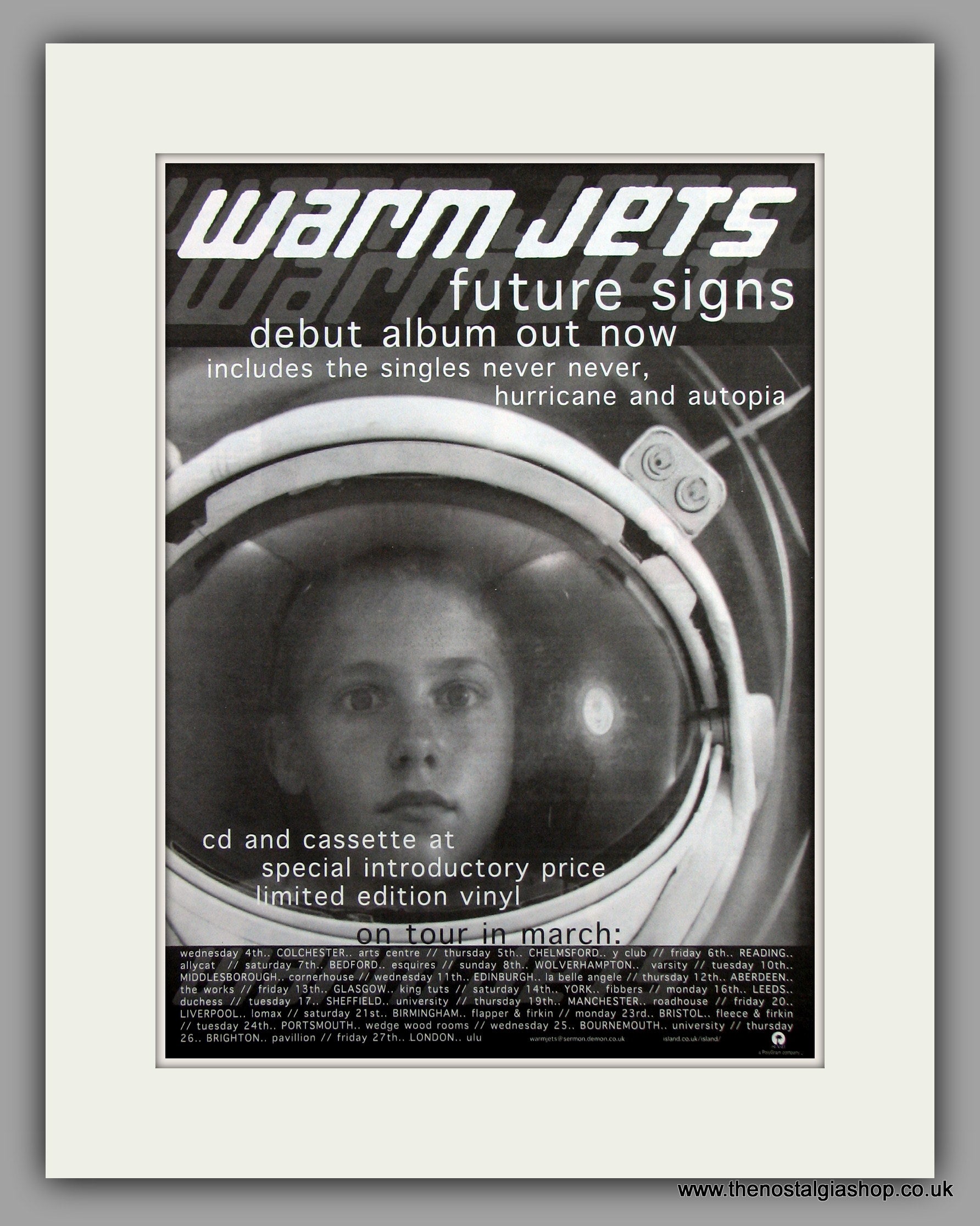 Warm Jets Future Signs. Original Vintage Advert 1998 (ref AD10215). Presented and supplied in a cream bevel cut mount with backing card and clear bag. Ready to fit in a 20x16 inch frame. The mounted advert will be posted via courier and well packed - protected with a sheet of hardboard to keep it rigid. Any questions or enquiries, please get in touch, we are here to help! All our adverts, unless clearly stated are originals from the date shown. They make excellent pieces of wall art and stunning gifts. Many are rare and hard to find and once sold, may not be replaced. Remember you are buying a piece of history. Website watermark is not on original.