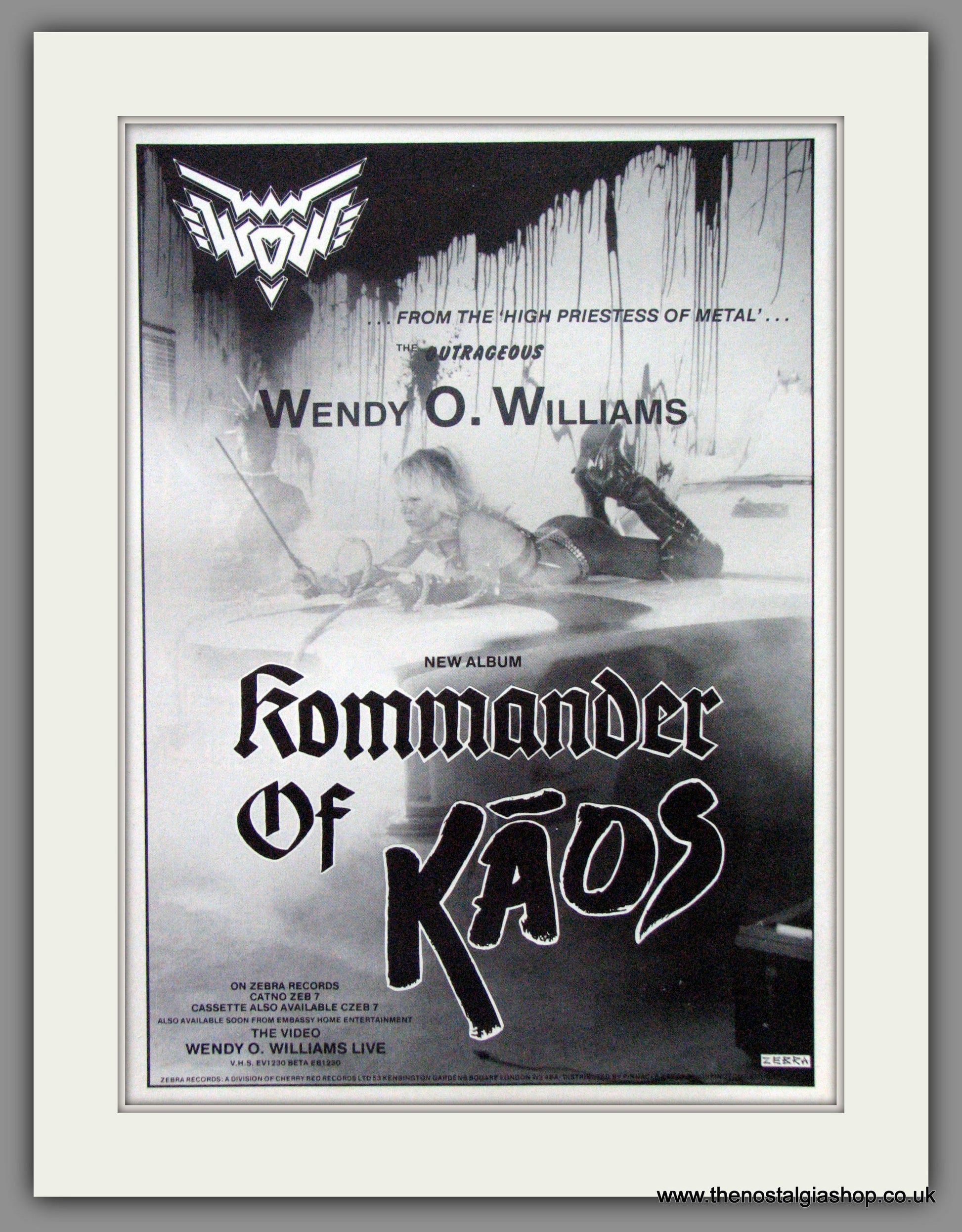 Wendy O. Williams. Kommander of Kaos. Large Original advert 1987. Presented in cream bevel cut mount with backing card and clear bag. Ready to fit in 20 x 16 inch frame. All our adverts, unless clearly stated are Originals from the date shown. They make excellent pieces of wall art and stunning gifts. Many are rare and hard to find and once sold, may not be replaced. Remember you are buying a piece of history. Website watermark is not on original.